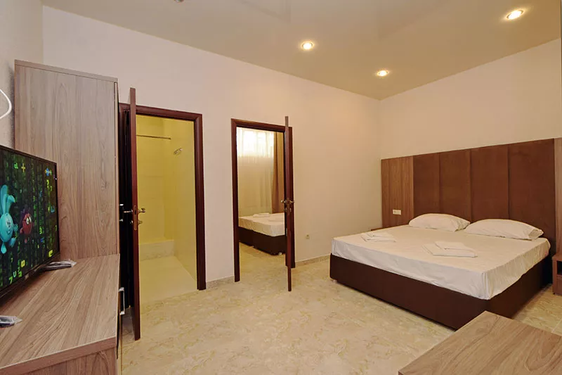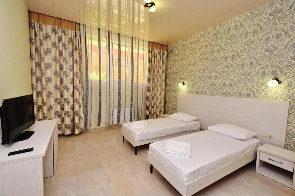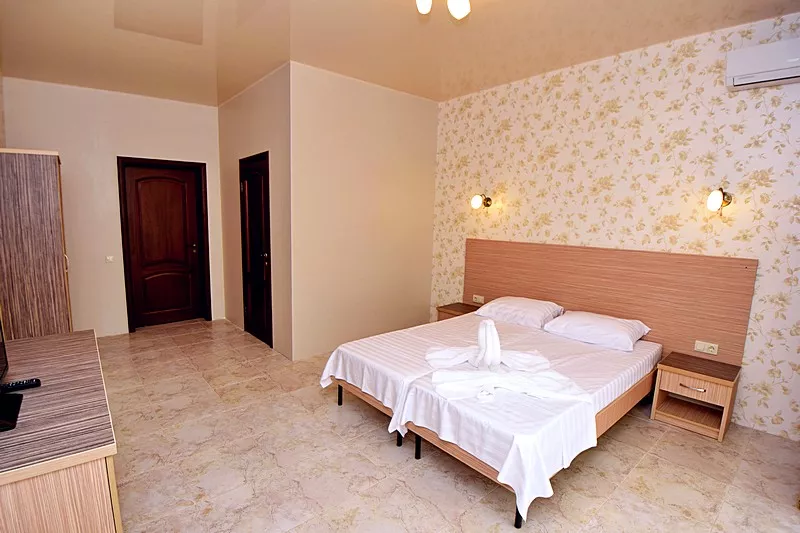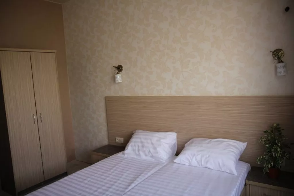 Мебель: односпальные или двуспальная кровати с ортопедическими матрасами, шкаф, прикроватные тумбочки, туалетный столик. Удобства: телевизор, интернет, холодильник. Примечание: несмотря на то, что в цокольных номерах нет сплит-систем, там всегда прохладно.