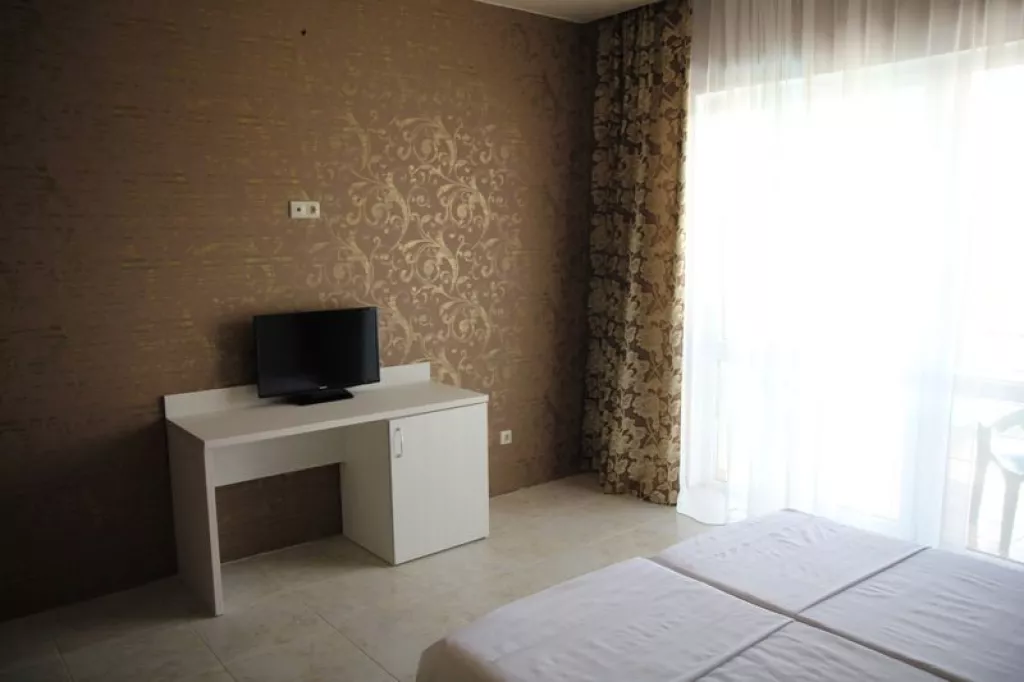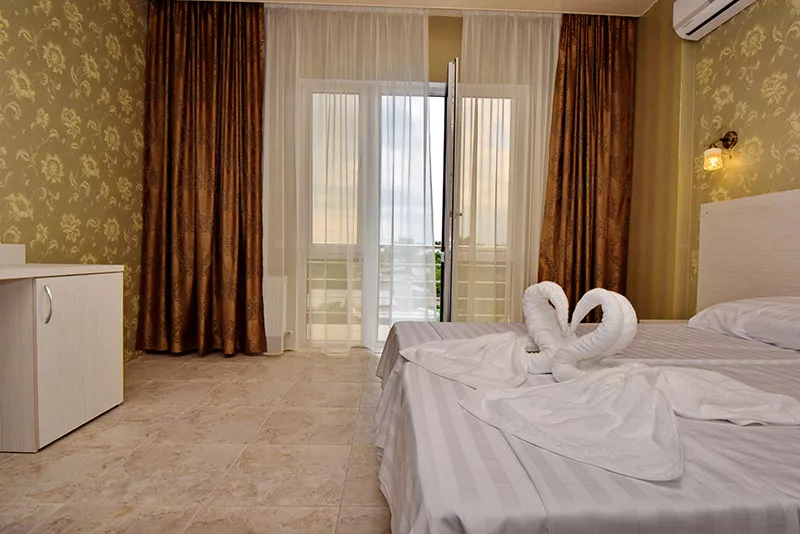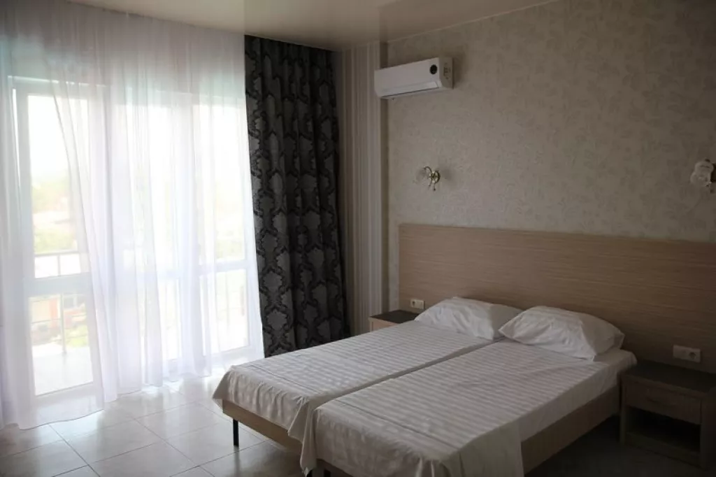Мебель: односпальные или двуспальная кровати с ортопедическими матрасами, шкаф, прикроватные тумбочки, туалетный столик, стол и стулья (на балконе). Удобства: сплит-система, телевизор, холодильник, балкон
