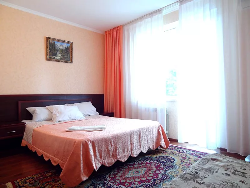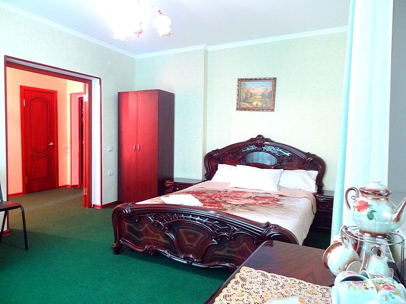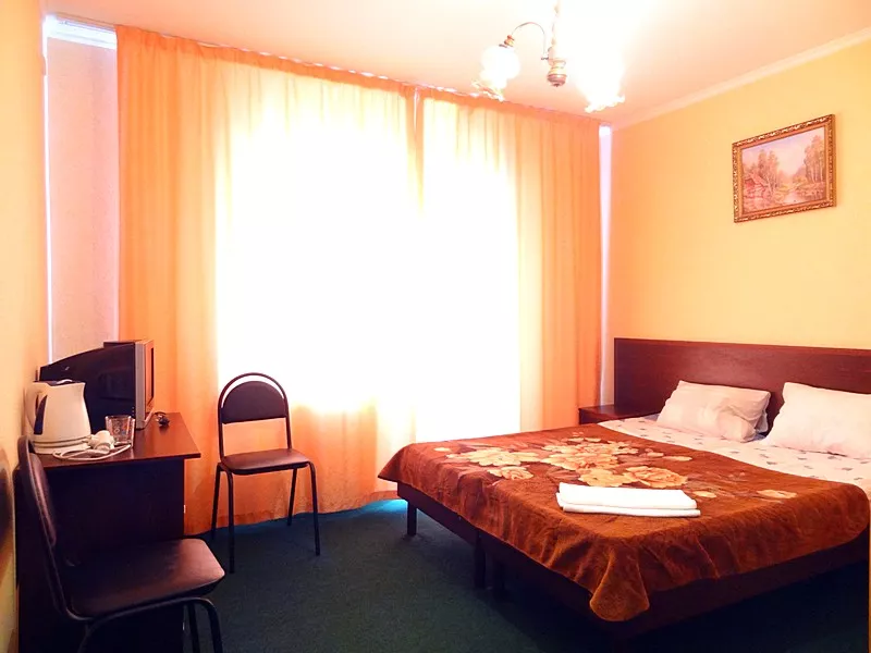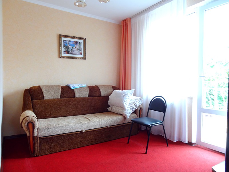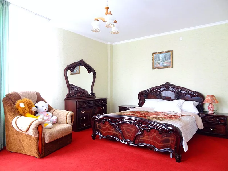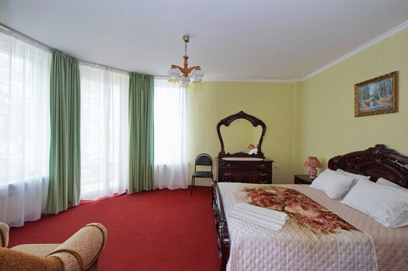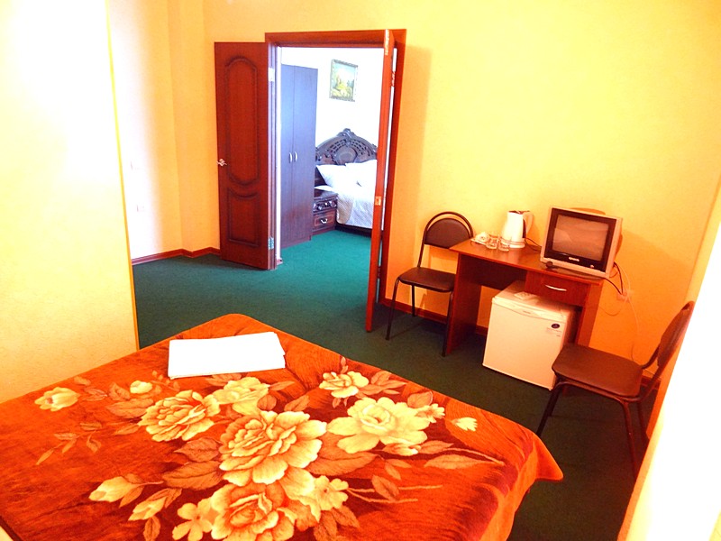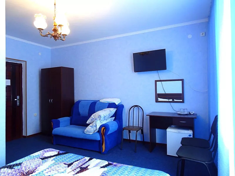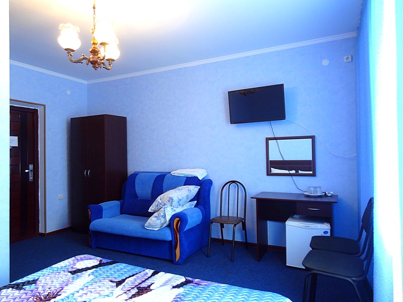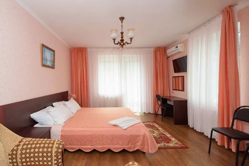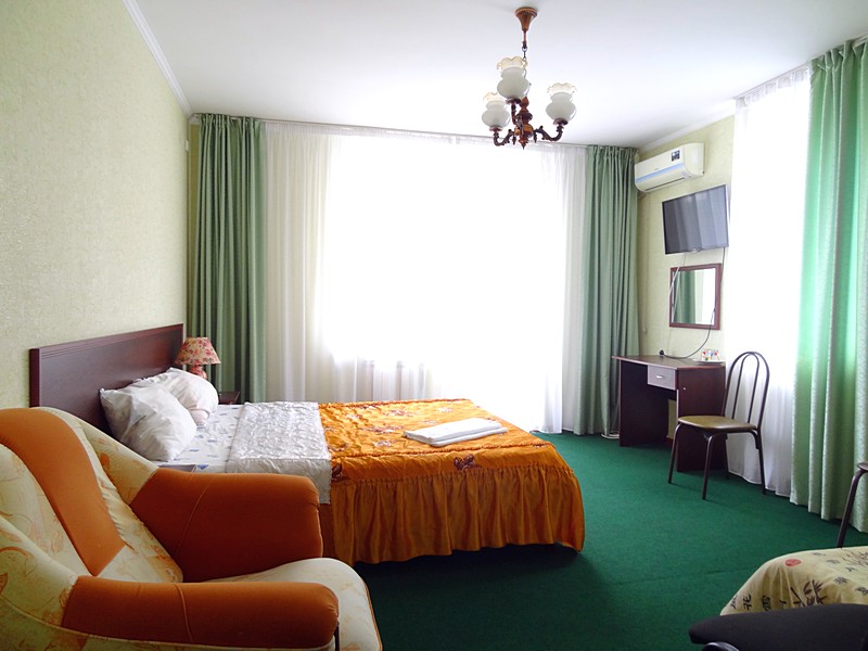 Мебель: односпальные или двуспальная кровати, кресло-кровать, шкаф, стулья, прикроватные тумбочки, журнальный столик, туалетный столик, стол, зеркало. Удобства: сплит-система, ЖК телевизор, холодильник, фен, посуда, балкон (наличие уточнять).