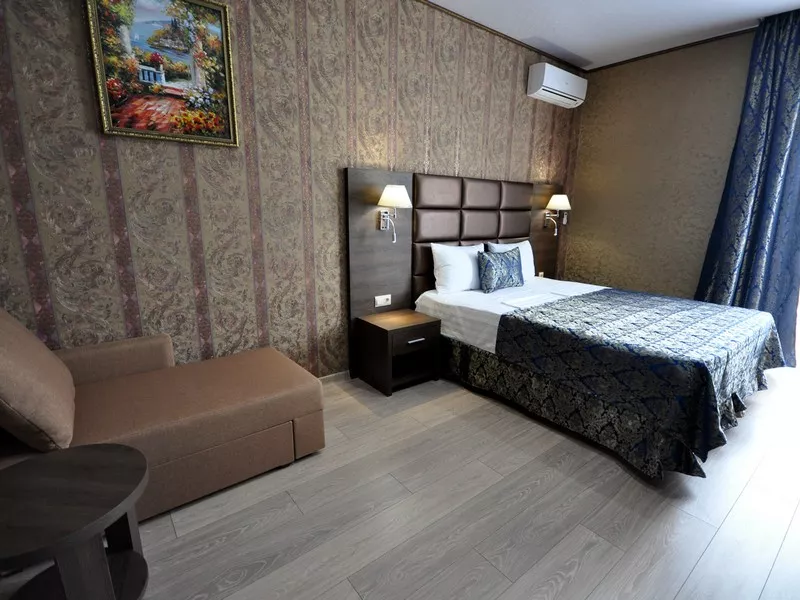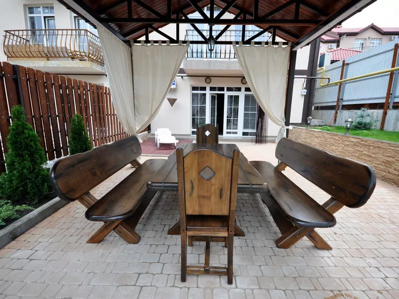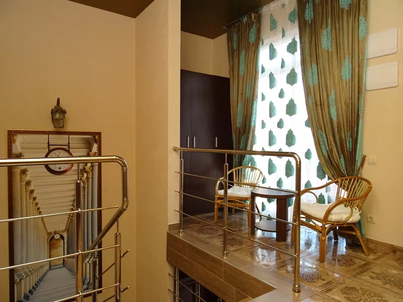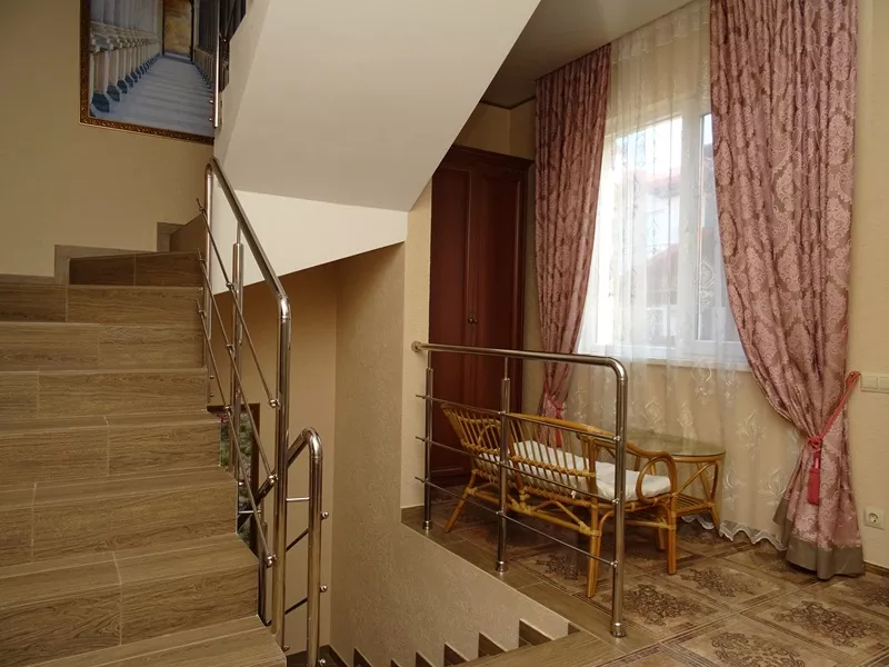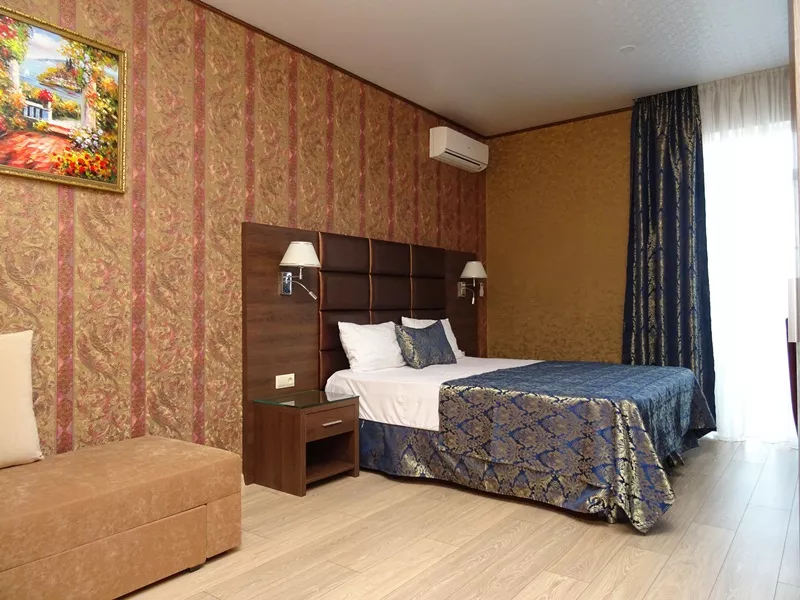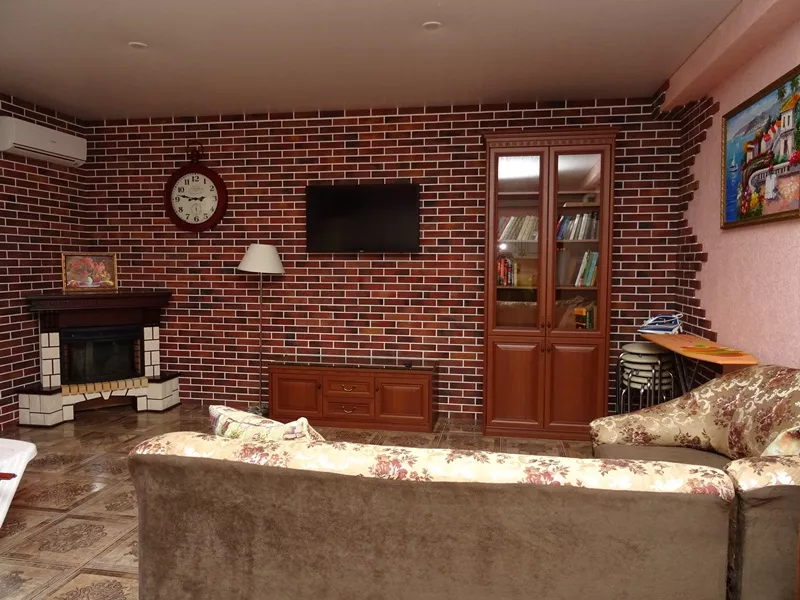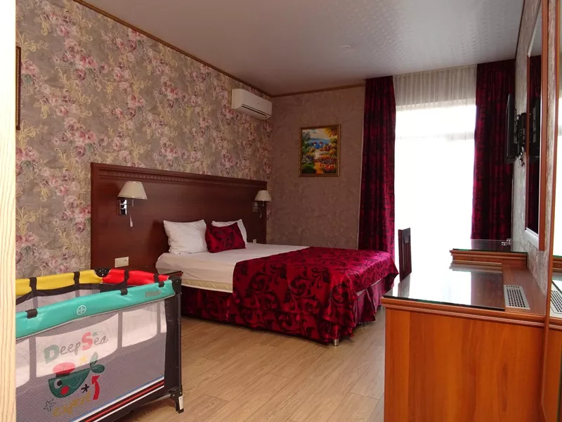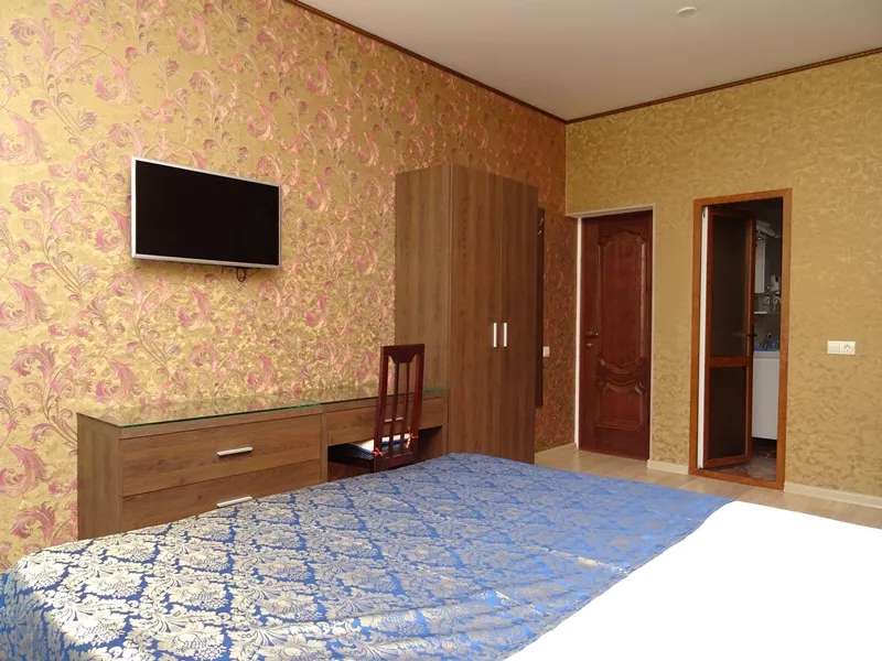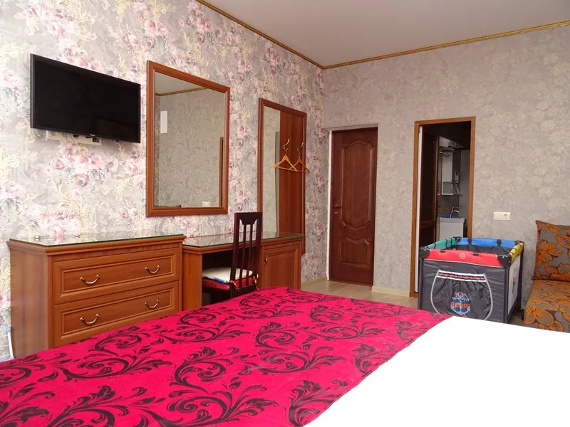 Мебель: двуспальная кровать, диван-кровать, стулья, шкаф, прикроватные тумбочки, стол, журнальный столик, туалетный столик, комод, прихожая, вешалка, зеркало. Удобства: сплит-система - 5 шт., телевизор, холодильник, СВЧ, эл. чайник, посуда, фен, балкон, отдельный двор.