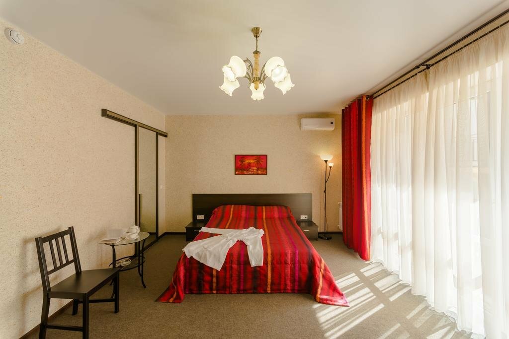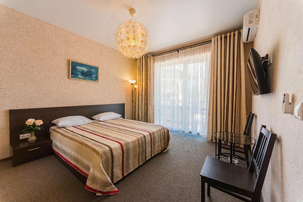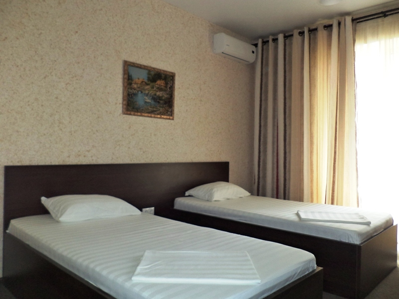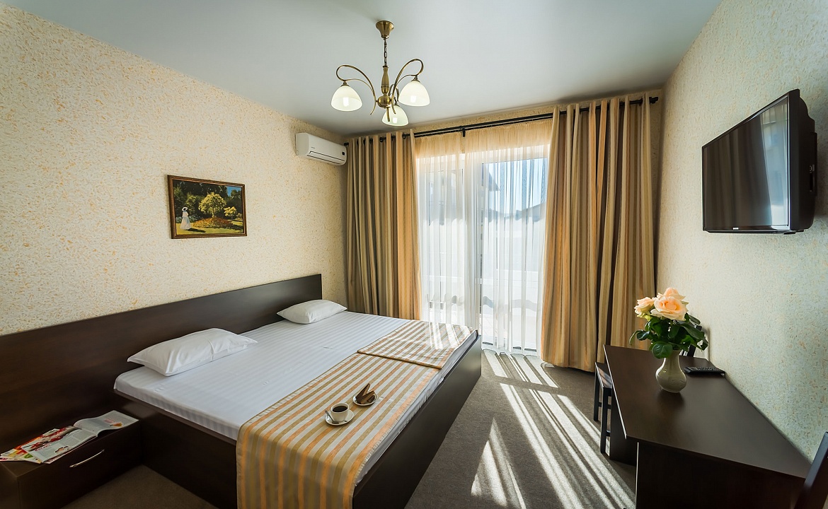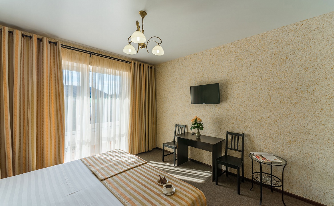 Санузел+Душ: в номере (душевая кабина + ванная). Мебель: односпальные или двуспальная кровати, шкаф, стулья, прикроватные тумбочки, туалетный столик. Удобства: сплит-система, телевизор, холодильник, балкон с мебелью.