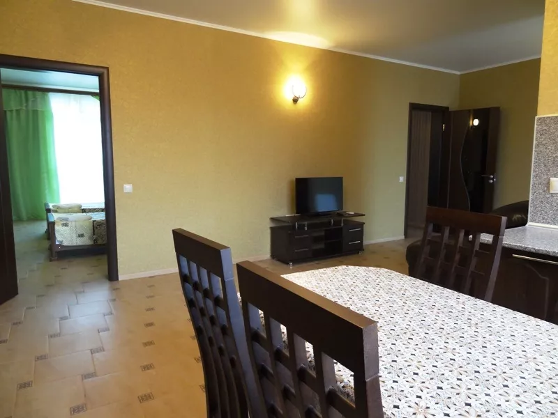 Мебель: двуспальная кровать, шкаф, прикроватные тумбочки, журнальный столик, туалетный столик, кухонный гарнитур, обеденная зона. Удобства: сплит-система, холодильник, телевизор, СВЧ, эл. чайник, посуда, фен, терраса.