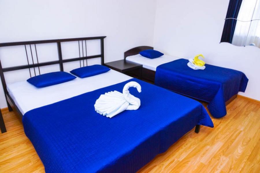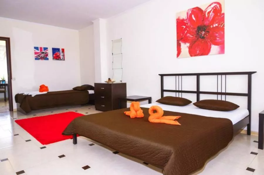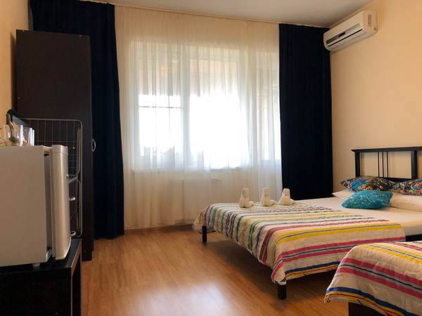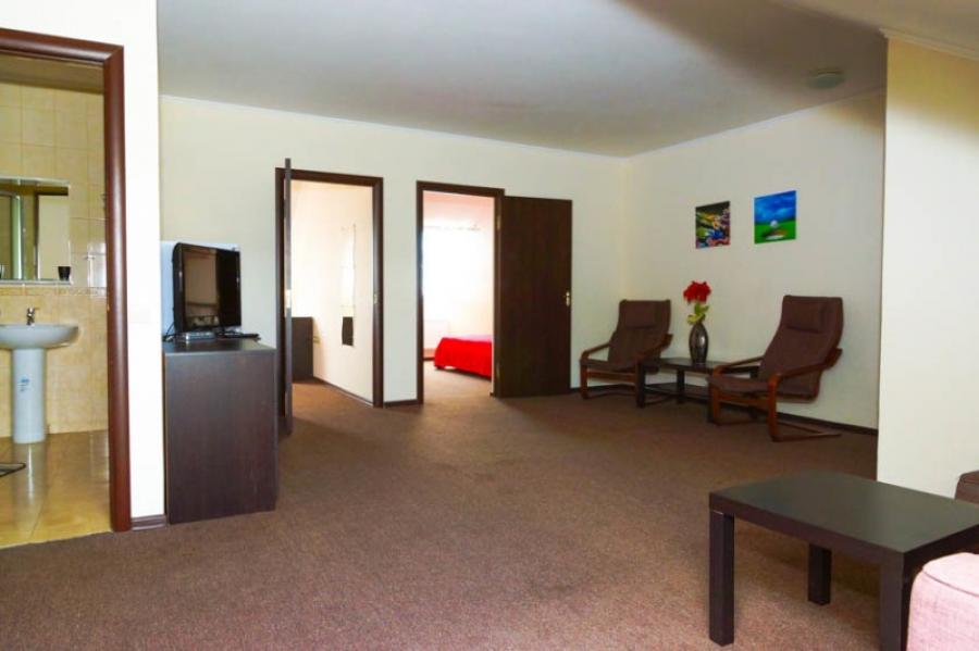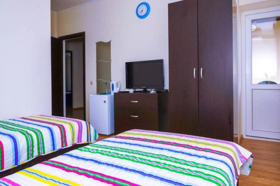 Мебель: односпальные или двуспальная кровати, диван-кровать, кресла, шкаф, стулья, прикроватные тумбочки, журнальный столик, комод, зеркало. Удобства: вентилятор, кондиционер, телевизор, спутниковое ТВ, телефон, холодильник, эл. чайник, СВЧ.