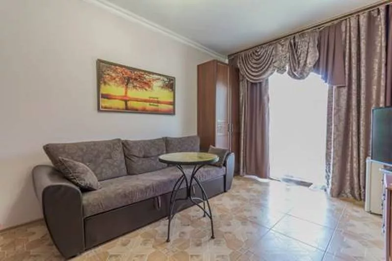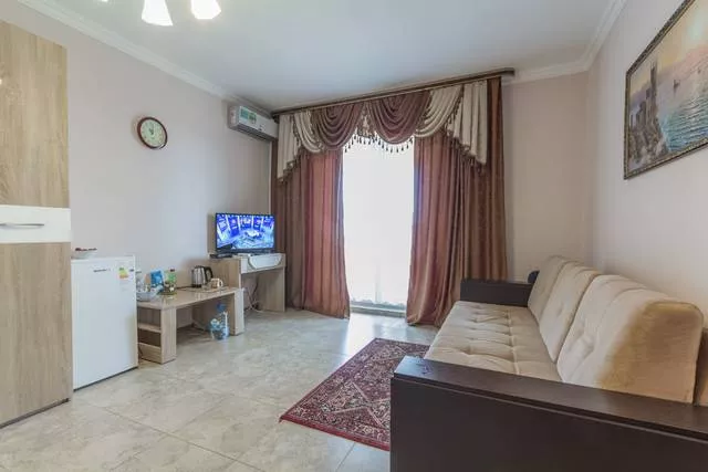 Мебель: односпальные или двуспальная кровати, диван-кровать, кресла, стулья, шкаф, прикроватные тумбочки, журнальный столик, туалетный столик, комод, столик, вешалка, зеркало. Удобства: кондиционер, холодильник, телевизор, спутниковое ТВ, интернет, балкон с видом на море, сейф.