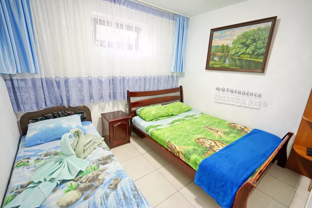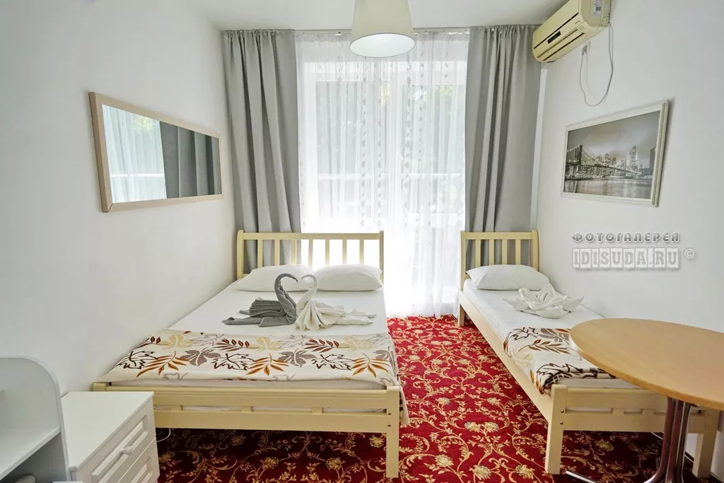 Мебель: односпальные или двуспальная кровати, прикроватные тумбочки, вешалка, зеркало. Удобства: вентилятор, телевизор.