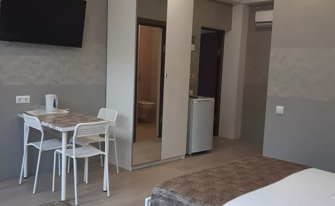 Мебель: двуспальная кровать, стулья, шкаф, прикроватные тумбочки, стол, зеркало, обеденная зона. Удобства: кондиционер, холодильник, телевизор, спутниковое ТВ, эл. чайник, посуда, интернет.
