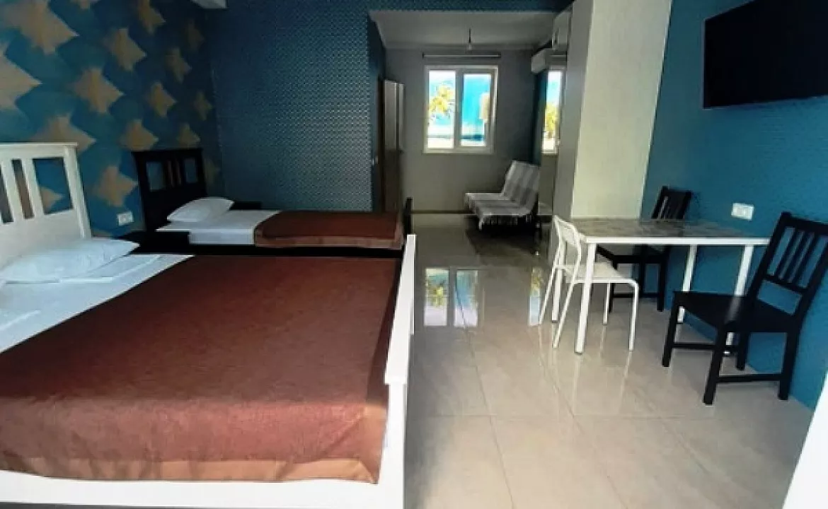 Мебель: односпальные и двуспальная кровати, стулья, шкаф, стол, вешалка, зеркало, обеденная зона. Удобства: кондиционер, холодильник, телевизор, спутниковое ТВ, эл. чайник, посуда, интернет.