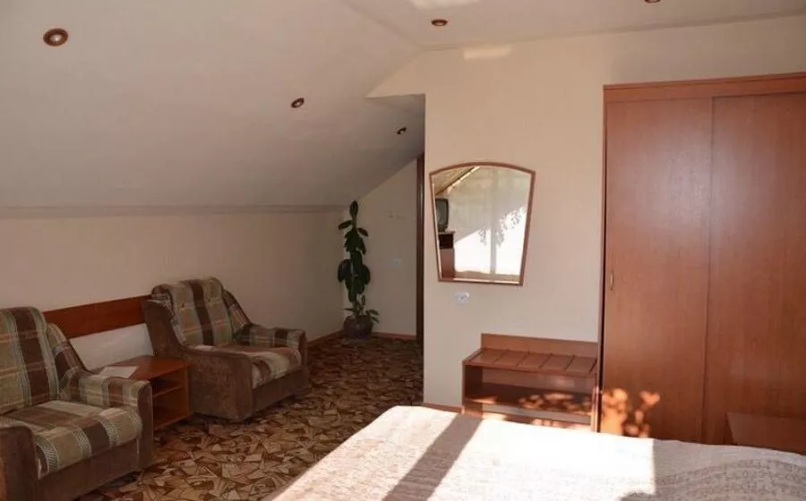 Мебель: двуспальная кровать, кресла, шкаф, прикроватные тумбочки, вешалка, зеркало. Удобства: кондиционер, телевизор, спутниковое ТВ, холодильник, фен (по требованию), эл. чайник, интернет.