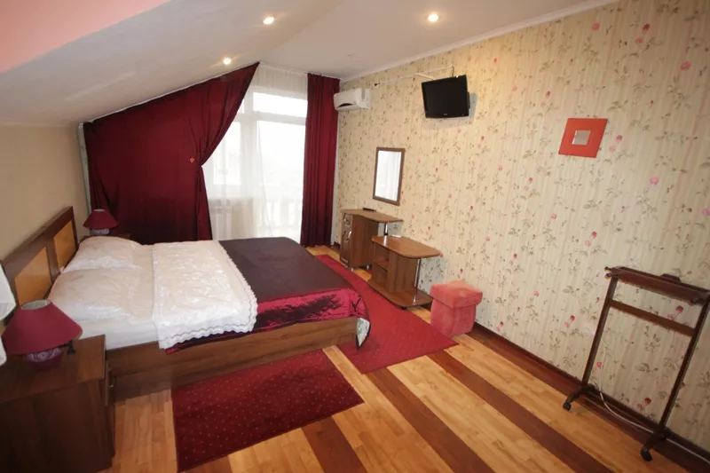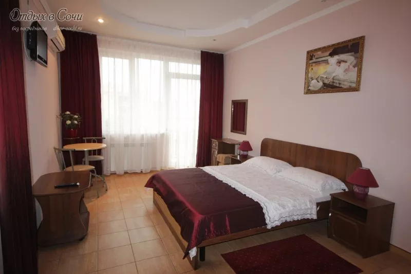 Мебель: односпальные или двуспальная кровати, кресло-кровать, шкаф, стулья, прикроватные тумбочки, журнальный столик, туалетный столик, стол, зеркало. Удобства: кондиционер, холодильник, телевизор, посуда, балкон.
