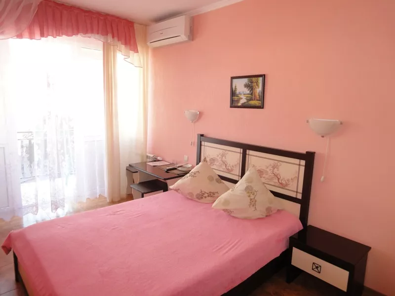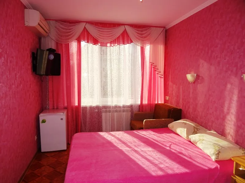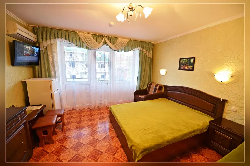 Во всех номерах холодильник, телевизор, кондиционер. Во всех люксах спальные гарнитуры. Есть комнаты с балконами где можно посидеть в кресле за столиками и провести приятно время. В каждом номере есть личная посуда (стаканы, тарелки, ложки, вилки, ножи).В люксы выдается по два полотенца на человека. Если вы предпочитаете готовить во время отдыха сами, то на 3 этаже есть общая кухня со всем необходимым оборудованием и посудой. Кроме этого есть рядом много столовых от 5 до 10 минут ходьбы. Все сделано для вашего отдыха. Воспользоваться гладильной доской и утюгом, вы самостоятельно приведете вещи в порядок, а при необходимости постирать белье можете обращаться к хозяевам, правда эта услуга платная и у вас попросят не большую цену. В номерах есть тазики для стирки. Коридоры и лестницы освещаются от датчиков движения. Замки в номерах электронные, открываются от карточек.
