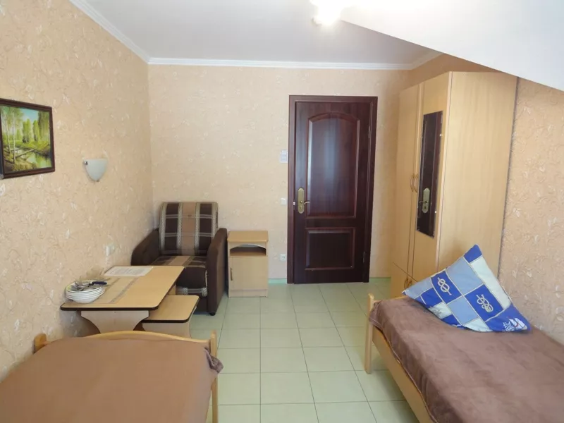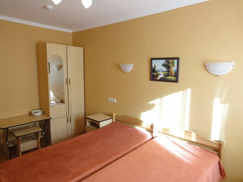 В гостевом доме Робинзон есть 15 номеров. С удобствами 2-х, 3-х, 4-х и местного размещения. Студия на 5 человек размещения. Комнаты с удобствами на этаже (на два номера санузел) 2-х и 3-х местные. Есть двух комнатные люксы с балконом сан узлом на 6 человек.