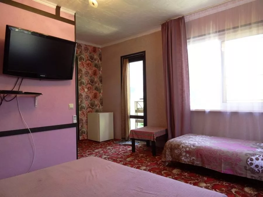 Мебель: односпальные или двуспальная кровати, кресло-кровать, шкаф, стулья, кресла, журнальный столик, зеркало. Удобства: сплит-система, телевизор, холодильник, интернет.