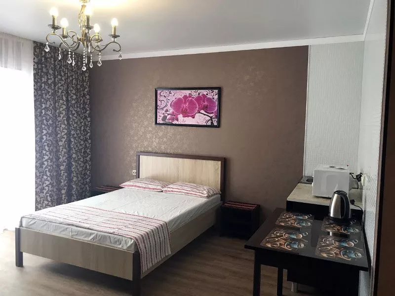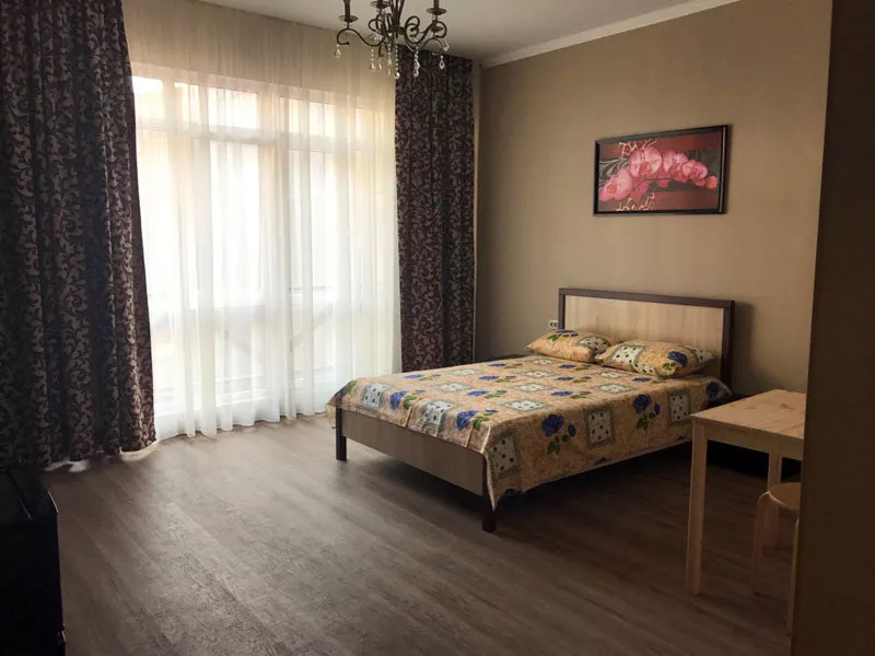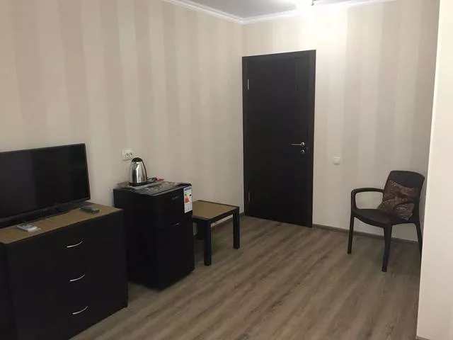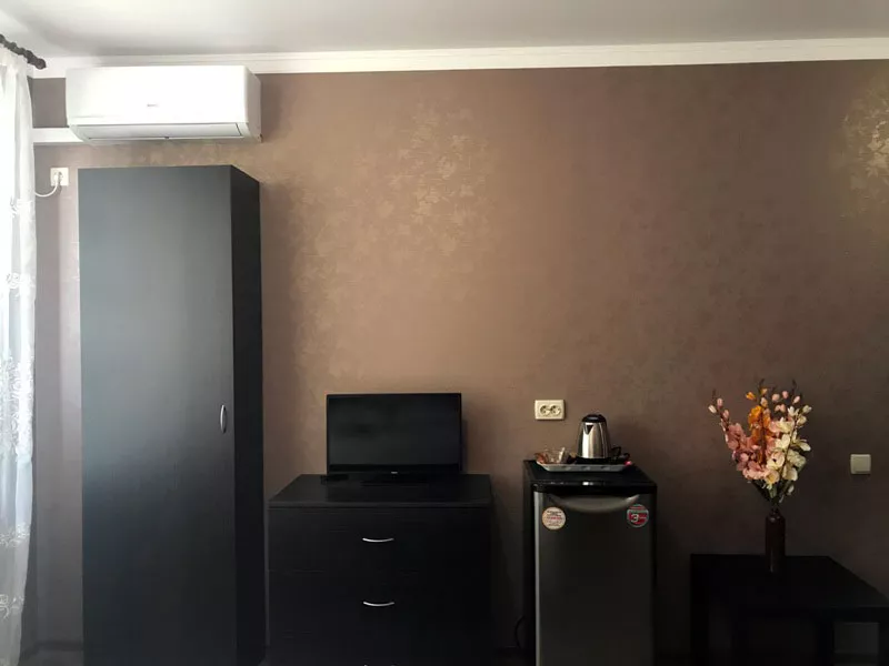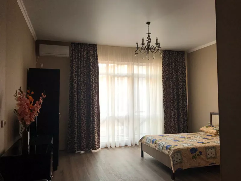 Мебель: двуспальная кровать, раскладушка (доп место), шкаф, прикроватные тумбочки, столик, комод, кресло. Удобства: сплит-система, телевизор, холодильник, чайник, балкон (наличие уточнять).