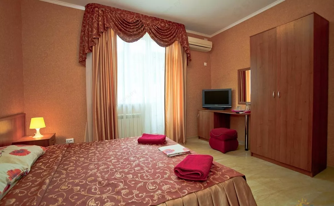 Мебель: односпальные или двуспальная кровати, диван-кровать, кресло-кровать, шкаф, стулья, прикроватные тумбочки, туалетный столик, зеркало. Удобства: кондиционер, холодильник, телевизор, посуда.