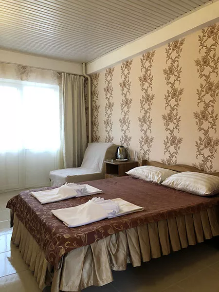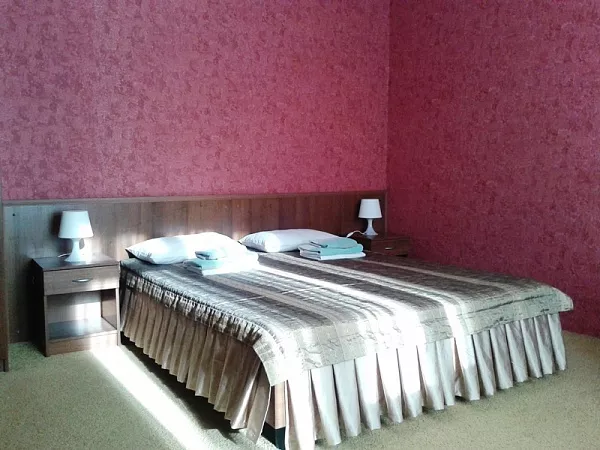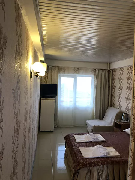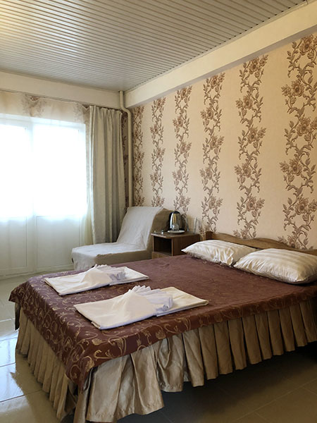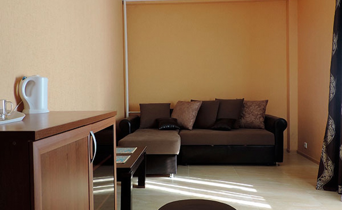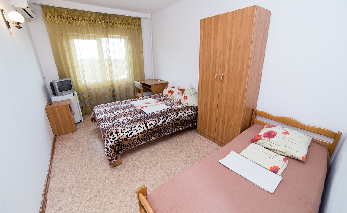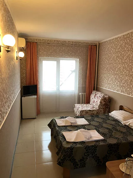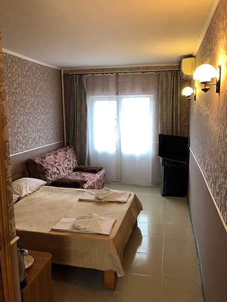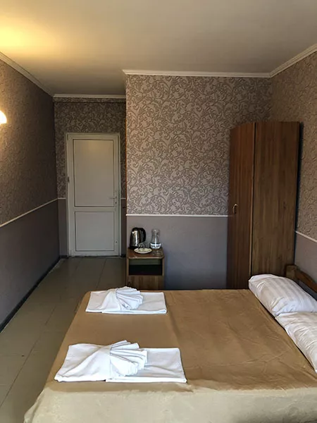 Мебель: односпальные или двуспальная кровати, диван-кровать, кресло-кровать, шкаф, стулья, прикроватные тумбочки, туалетный столик, зеркало. Удобства: кондиционер, холодильник, телевизор, посуда.