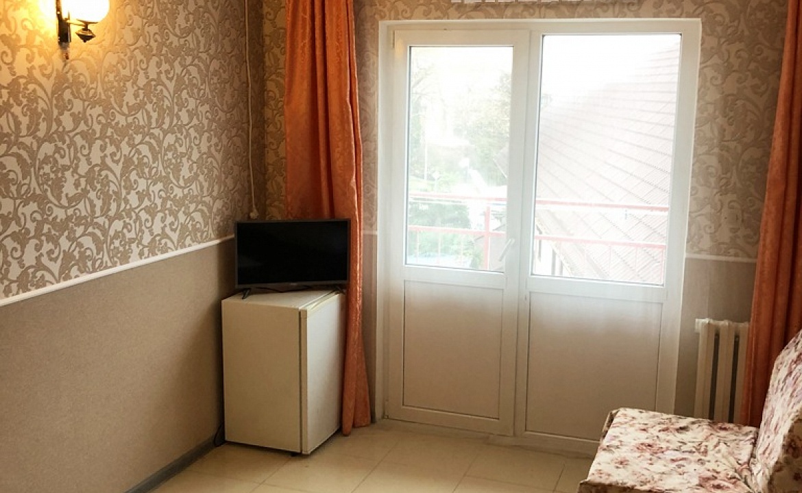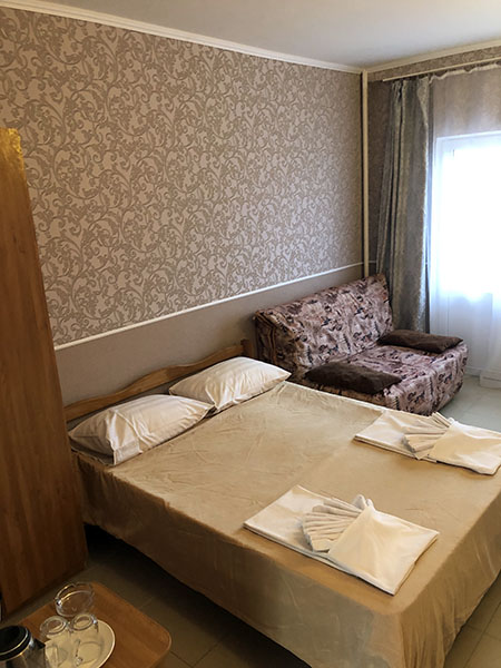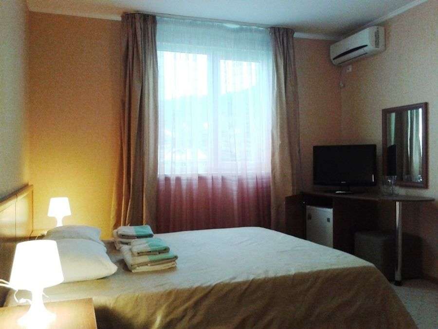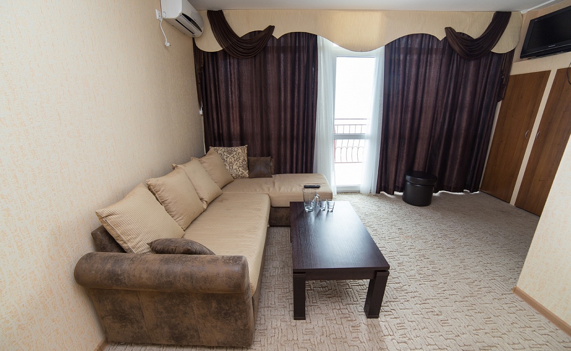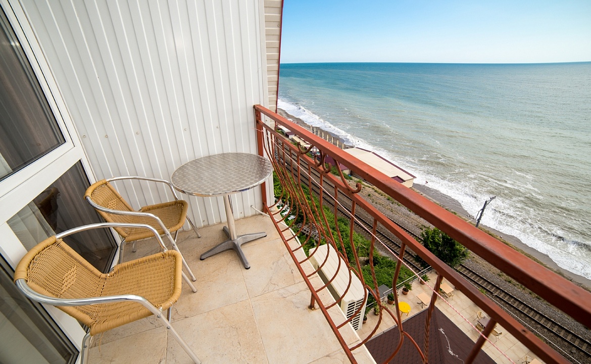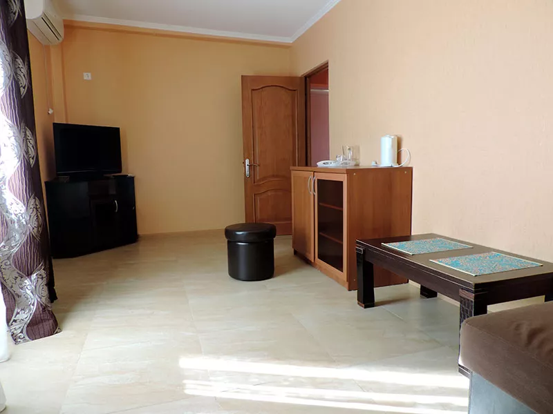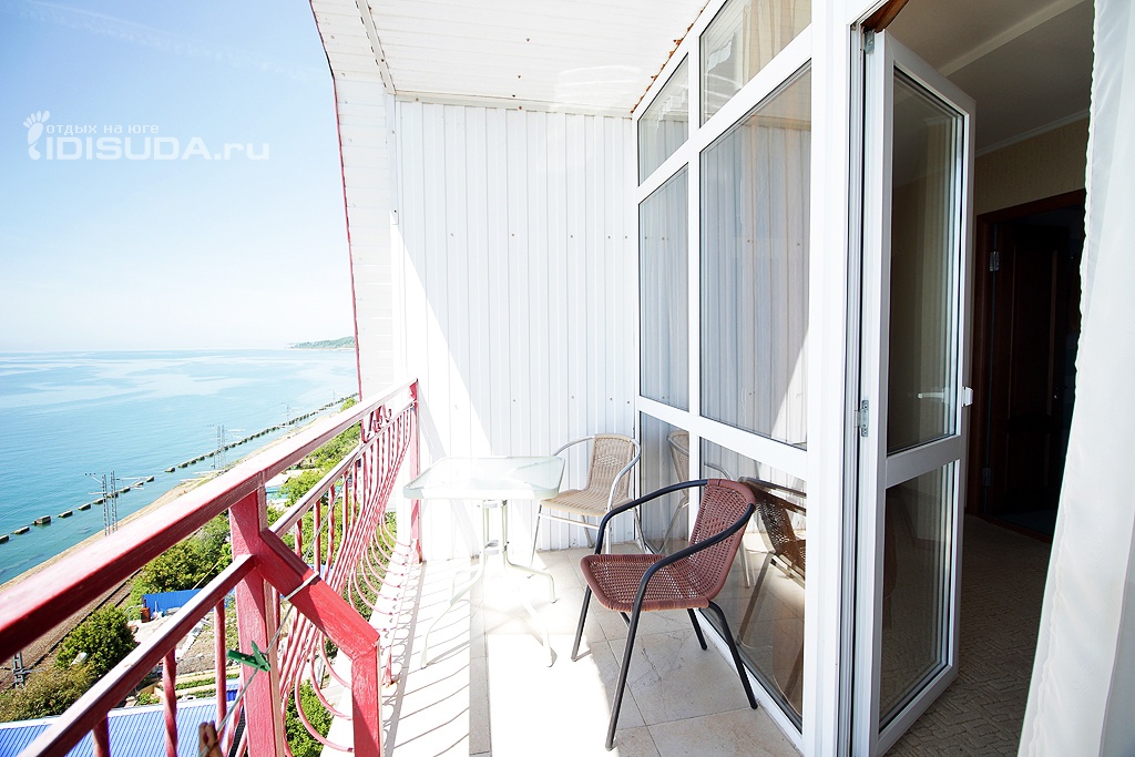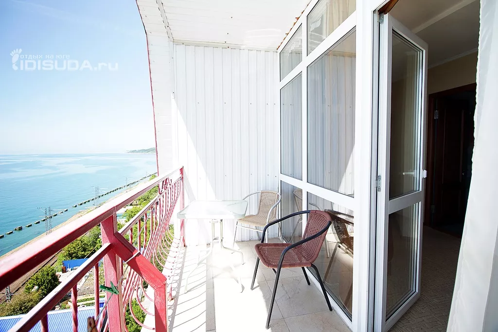 Мебель: двуспальная кровать, диван-кровать, шкаф, стулья, прикроватные тумбочки, журнальный столик, зеркало. Удобства: кондиционер, холодильник, телевизор, 2 балкона с видом на море.