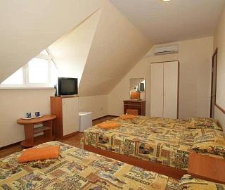 Мебель: односпальные и двуспальная кровати, кресло-кровать, шкаф, стулья, прикроватные тумбочки, журнальный столик, зеркало. Удобства: кондиционер, холодильник, телевизор.