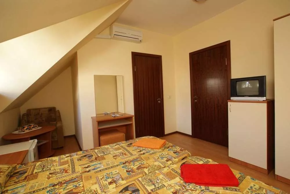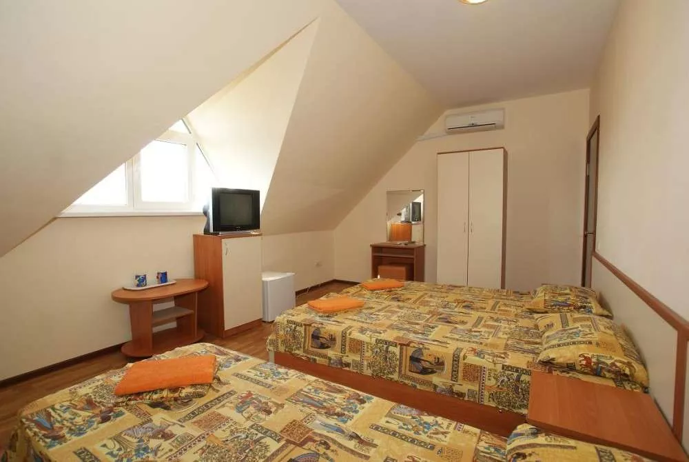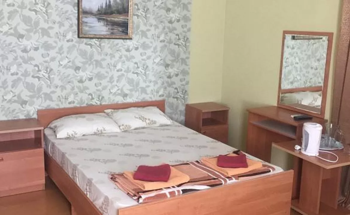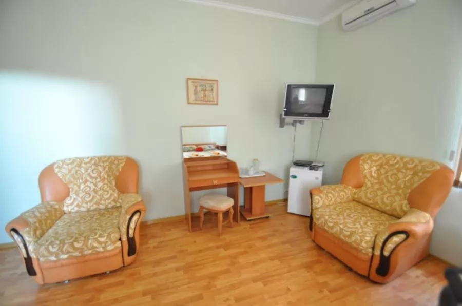 Мебель: односпальные и двуспальная кровати, кресло-кровать, шкаф, стулья, прикроватные тумбочки, журнальный столик, зеркало. Удобства: кондиционер, холодильник, телевизор.