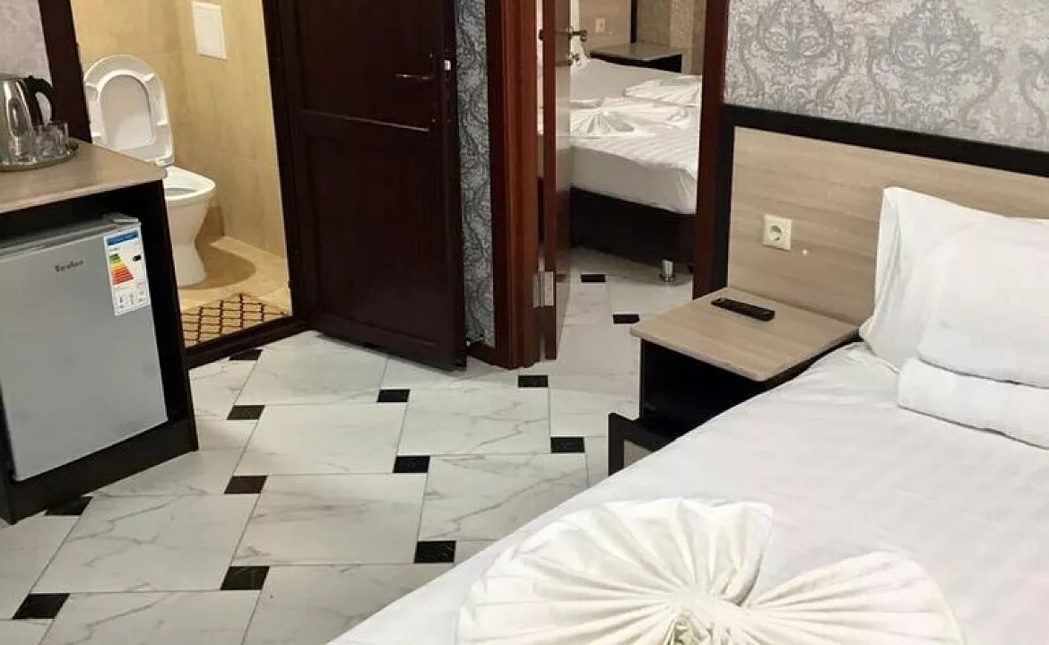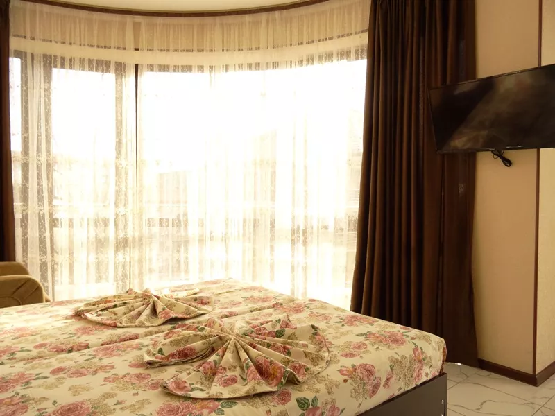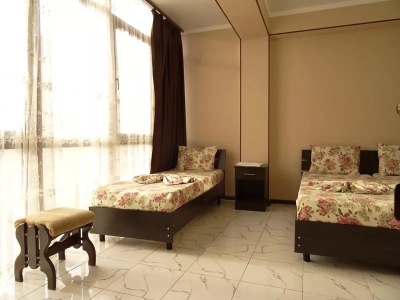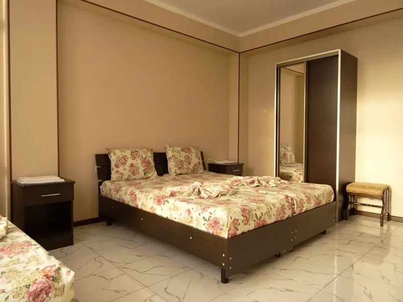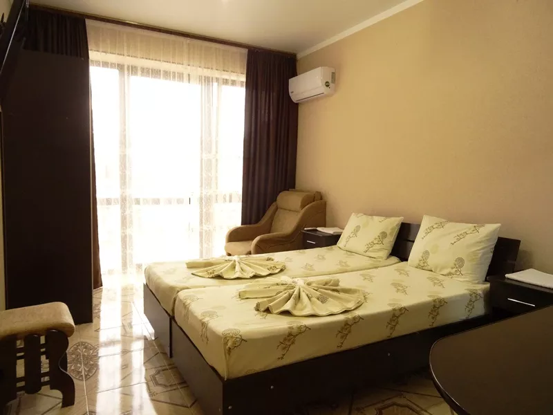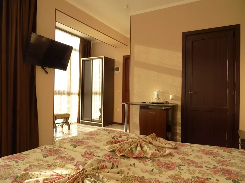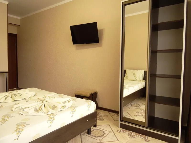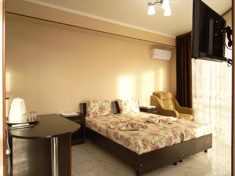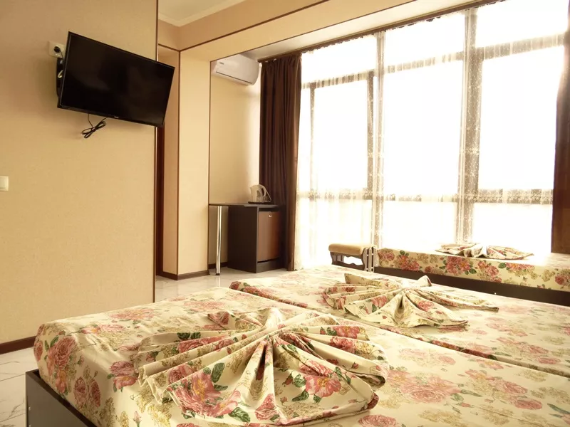 Мебель: односпальные или двуспальная кровати, кресло-кровать, шкаф, стулья, прикроватные тумбочки, журнальный столик, стол, вешалка, зеркало. Удобства: кондиционер, телевизор, интернет, холодильник, балкон (наличие уточнять).
