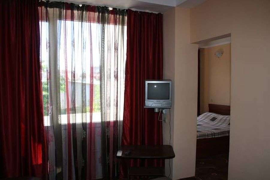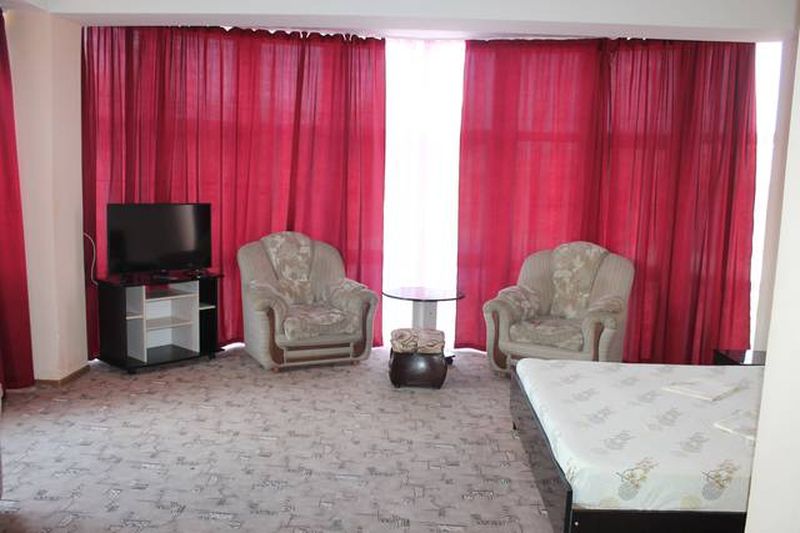 Мебель: двуспальная кровать, диван-кровать, шкаф, стулья, прикроватные тумбочки, журнальный столик, туалетный столик, комод, прихожая, вешалка, зеркало. Удобства: кондиционер, телевизор, холодильник, посуда, балкон - в номере кулеры - на этаже.
