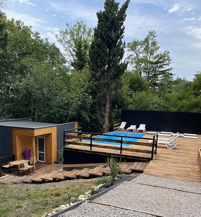 Частный сектор.Домик находится на территории 10 соток.На верхней части участка - хозяйский дом и большая парковка.На нижней части - два домика(но сдается только один.Во втором еще ведется ремонт) бассейн 3х7 метров без обогрева,сезонный с шезлонгами.Мангальная зона.