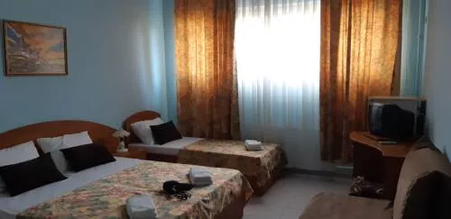 В номере: односпальные или двуспальная кровати, кресло-кровать, стулья, пуфики, шкаф, прикроватные тумбочки, стол, вешалка, зеркало, кондиционер, телевизор, холодильник, спутниковое ТВ, посуда, интернет, фен, балкон.