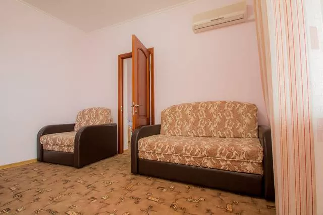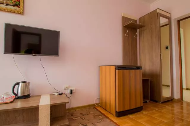 В номере: шкаф, тумбочки, стулья, кровать двуспальная, кровати односпальные, кресло-кровать, стол, журнальный столик, вешалка, балкон, посуда, телевизор, холодильник, электрочайник, Wi-Fi интернет, сплит-система, интернет.