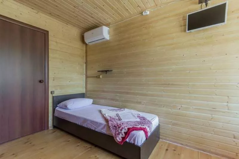 В номере: односпальные кровати, диван-кровать, кресло-кровать, кресла, стулья, прикроватные тумбочки, журнальный столик, вешалка, зеркало, кондиционер, телевизор, цифровое ТВ. душ и туалет во дворе.