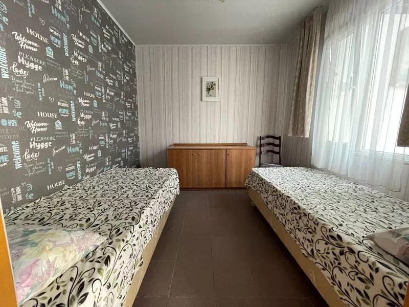 Мебель: односпальные кровати, шкаф, прикроватные тумбочки, журнальный столик, вешалка, зеркало. Удобства: вентилятор, телевизор, холодильник.