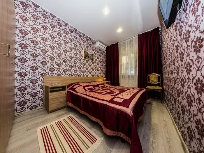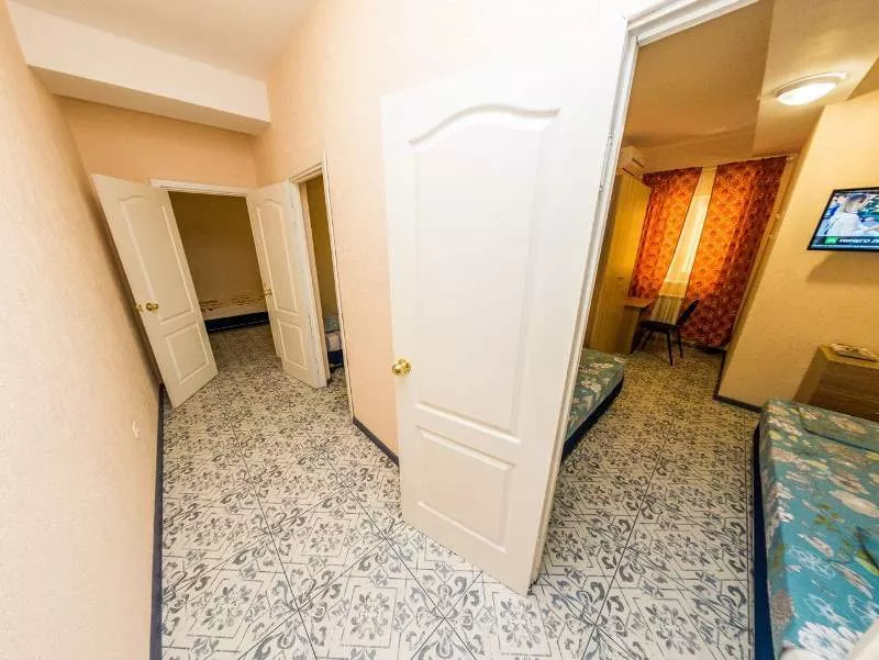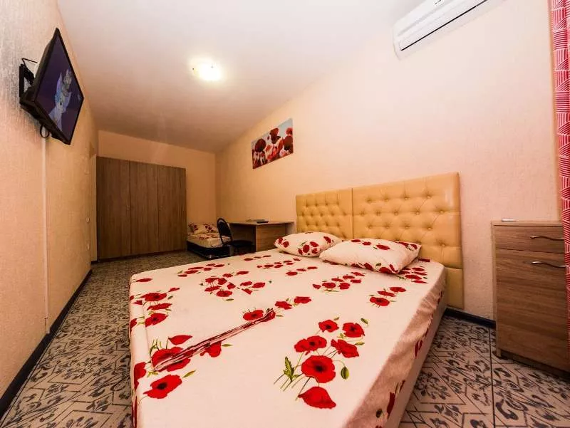 Мебель: односпальные и двуспальная кровати, кресло-кровать, стол, стулья, шкаф, прикроватные тумбочки, зеркало, кухонный гарнитур, обеденная зона. Удобства: сплит-система, холодильник, телевизор, Wi-Fi интернет, СВЧ (наличие уточнять), чайник, посуда, фен.