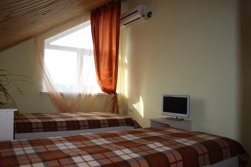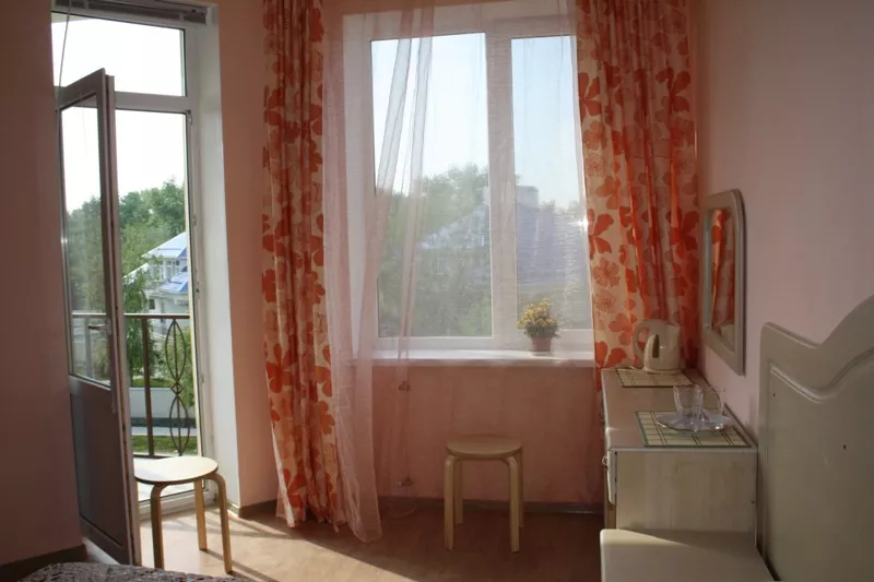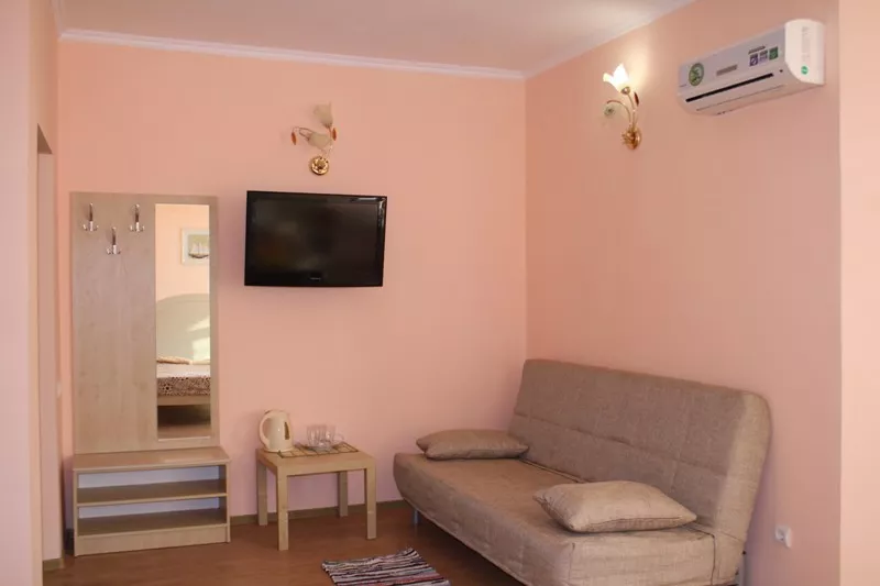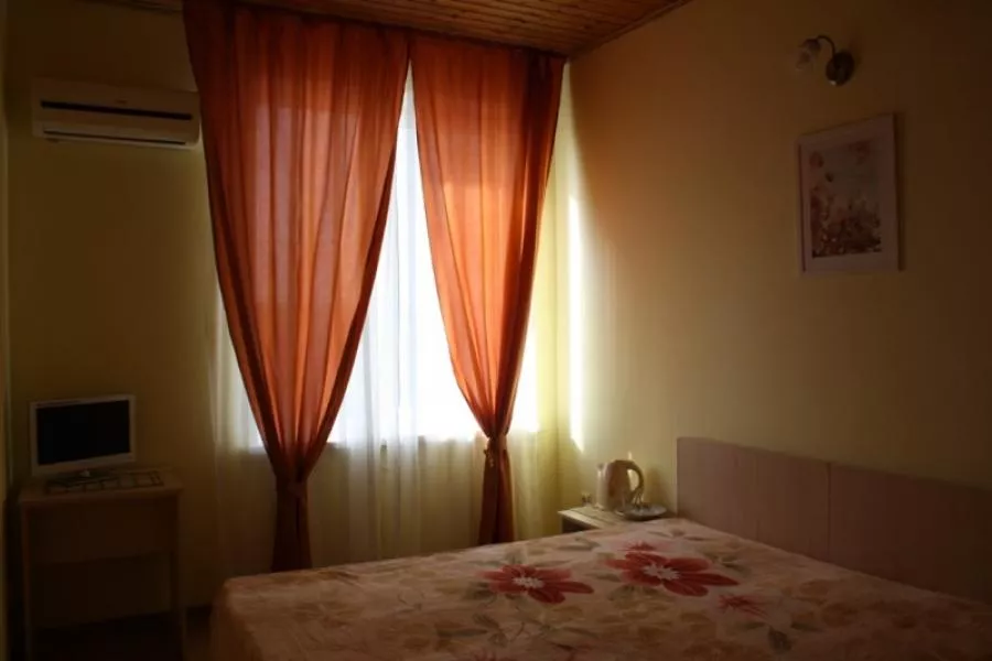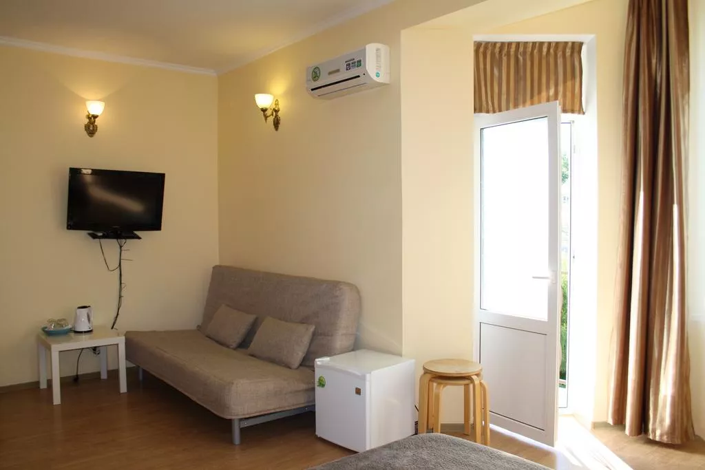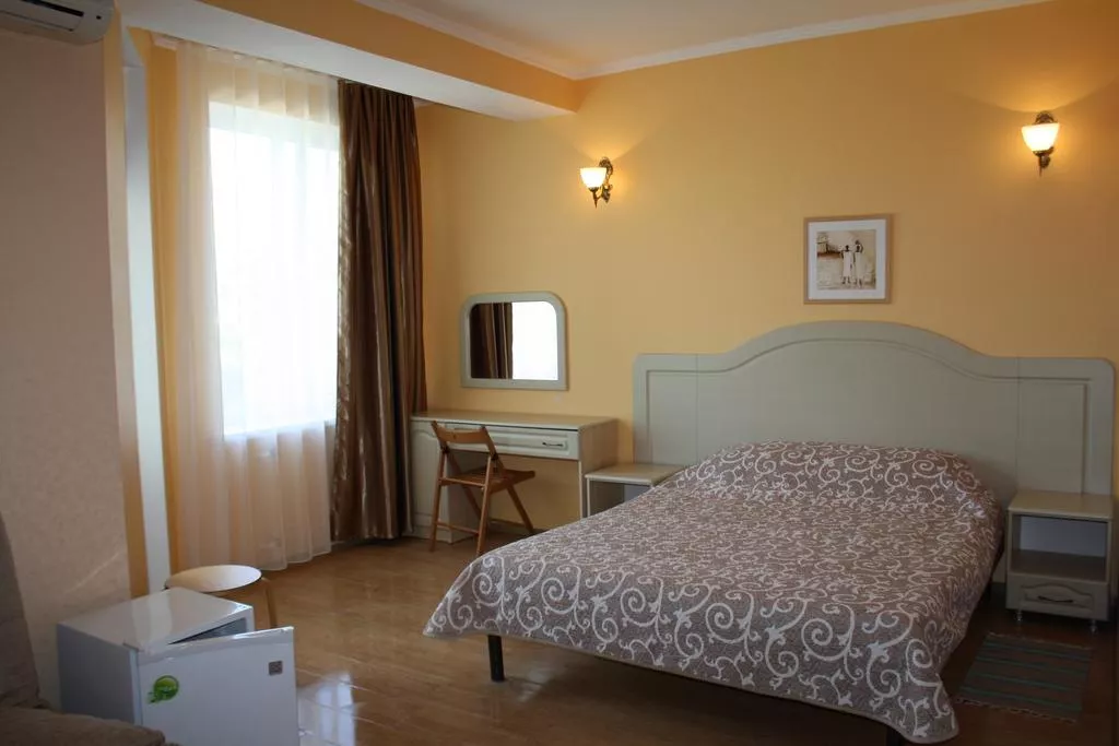 Мебель: односпальные или двуспальная кровати, диван-кровать, кресло-кровать, шкаф, стулья, прикроватные тумбочки, журнальный столик, зеркало. Удобства: сплит-система, холодильник (на этаже), телевизор, эл. чайник, посуда.