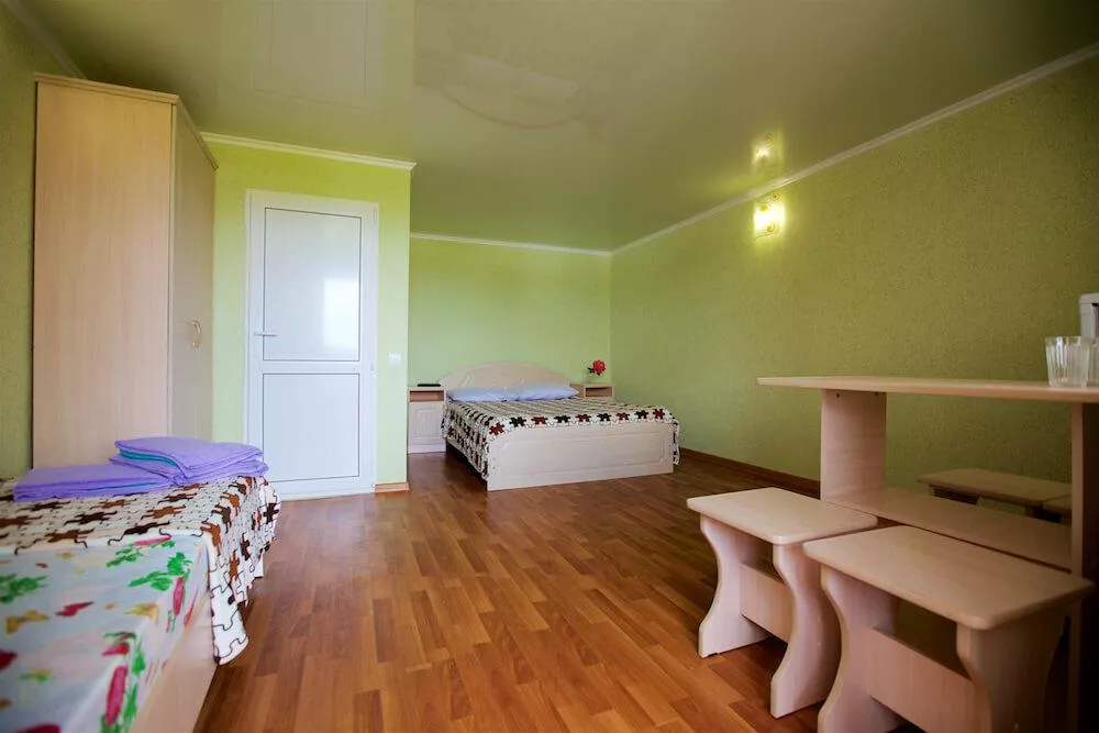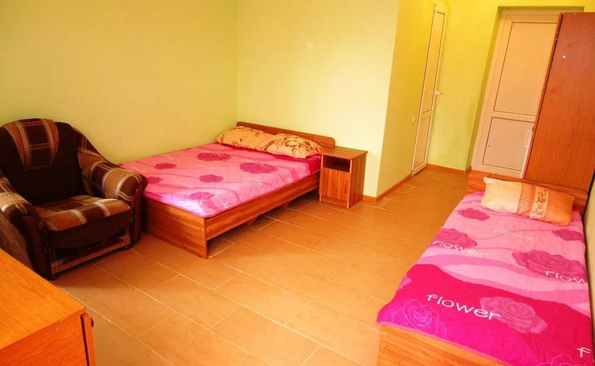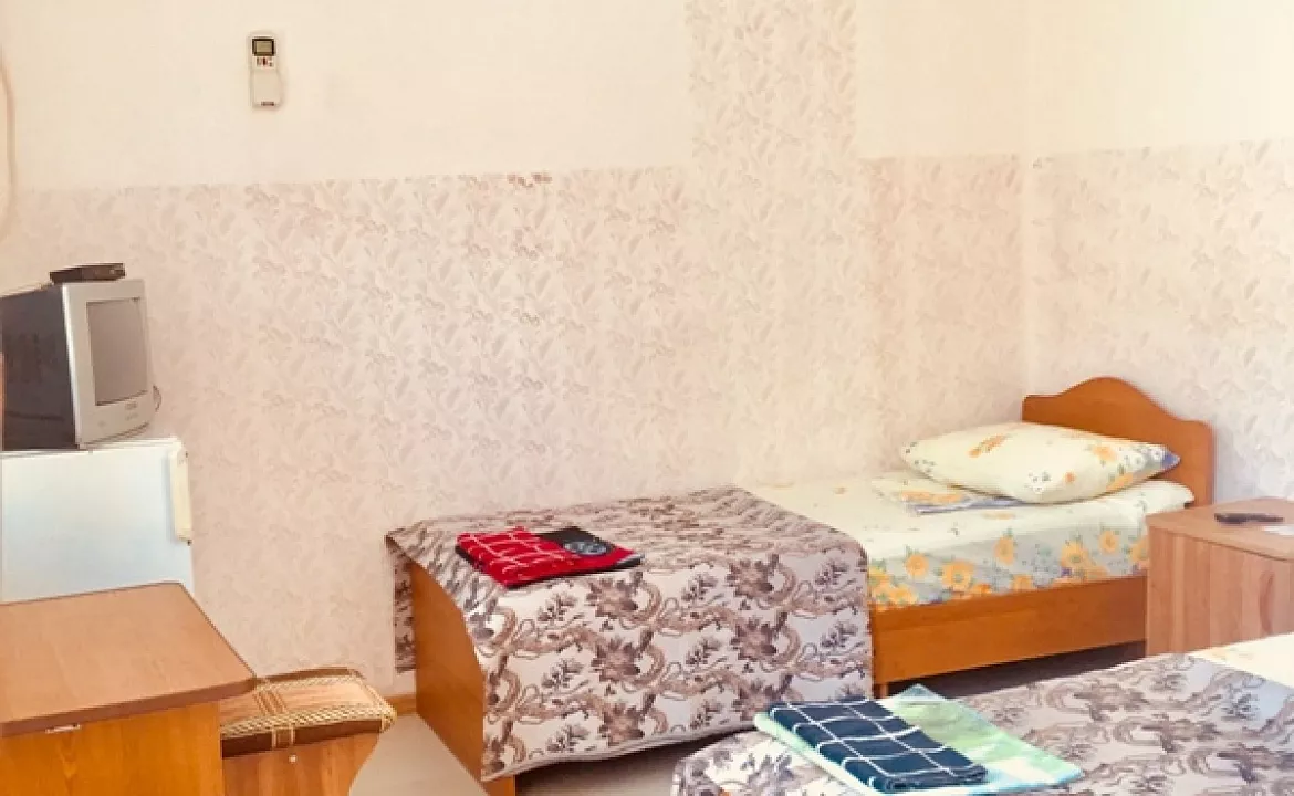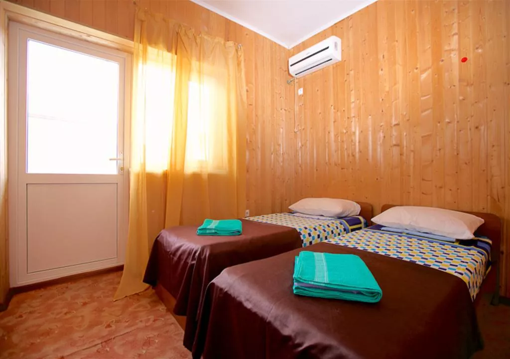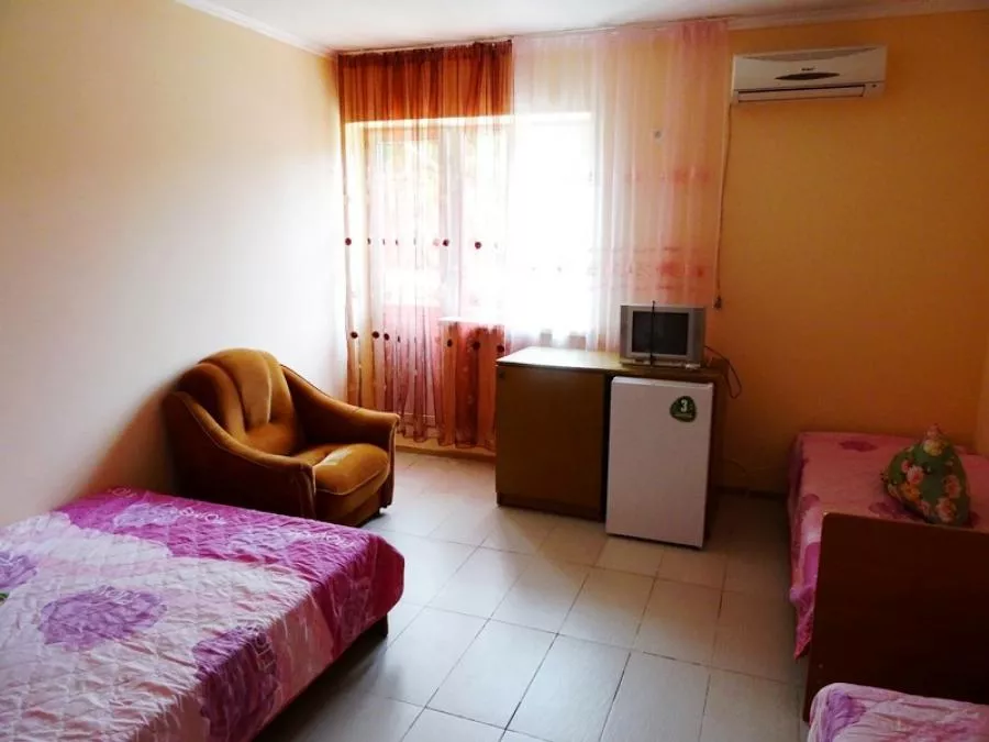 Мебель: 2 односпальные и двуспальная кровати, раскладушка/кресло-кровать (доп.место), прикроватные тумбочки, шкаф, стулья, индивидуальная пластиковая мебель (на балконе/общей веранде). Удобства: сплит-система, телевизор с ТВ приставкой, холодильник, балкон/общая веранда, пол - плитка/ковролин.