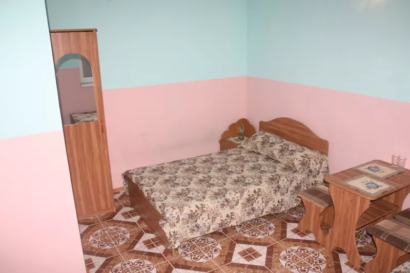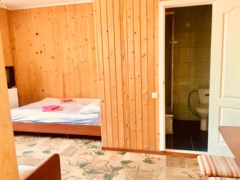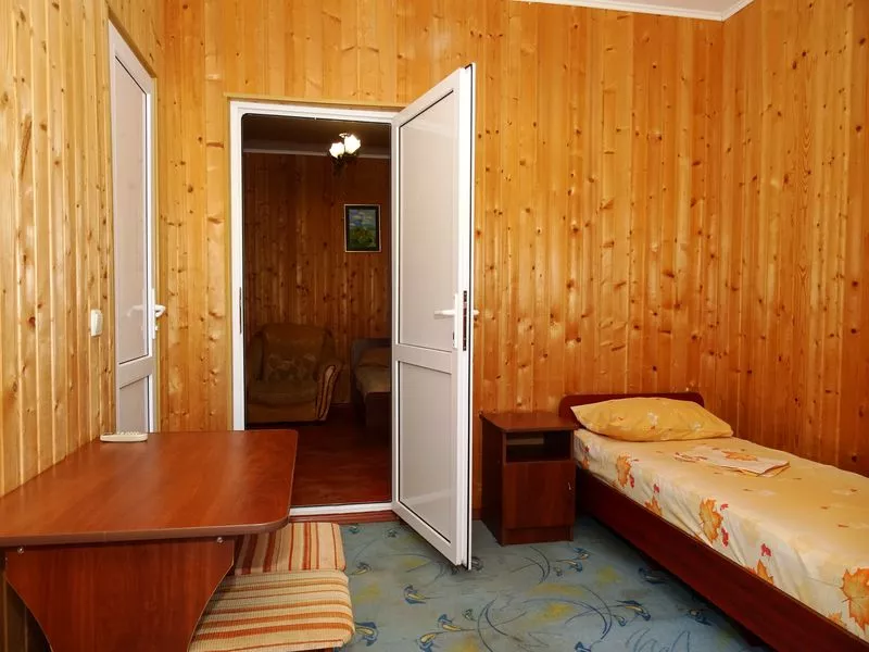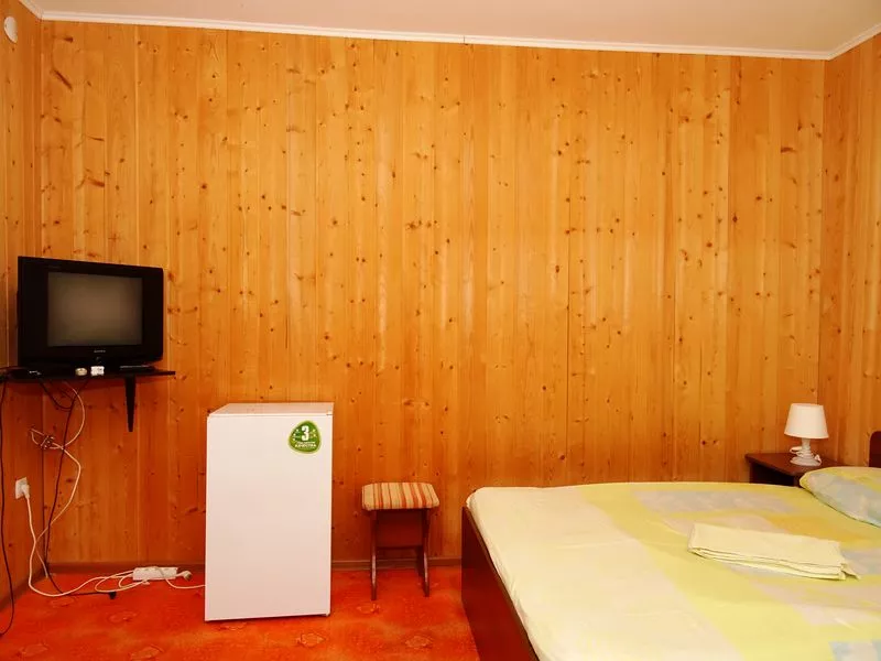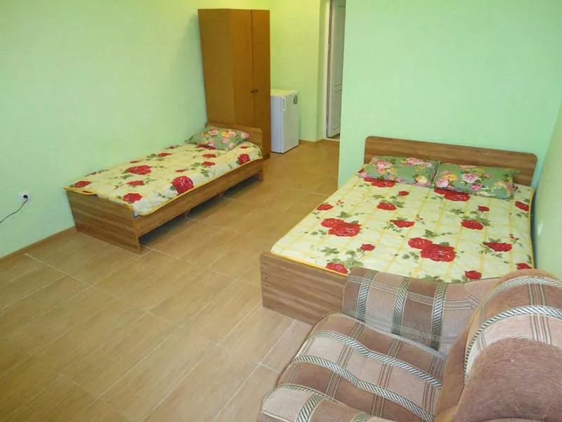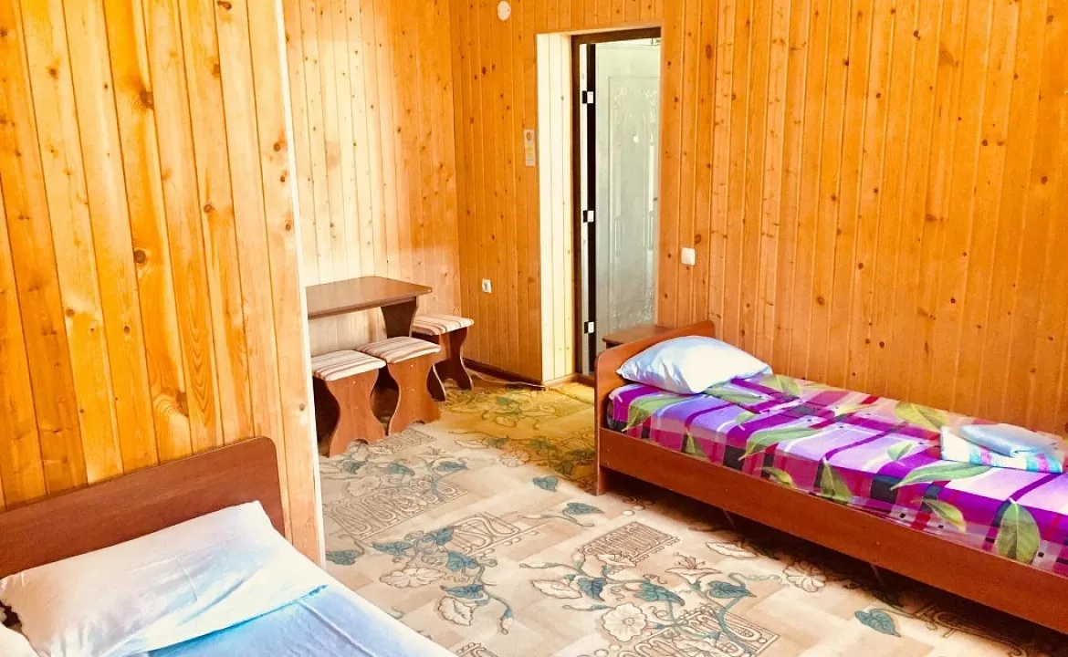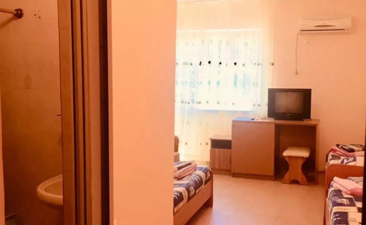 Мебель: 2 односпальные и двуспальная кровати, раскладушка/кресло-кровать (доп.место), прикроватные тумбочки, шкаф, стулья, индивидуальная пластиковая мебель (на балконе/общей веранде). Удобства: сплит-система, телевизор с ТВ приставкой, холодильник, балкон/общая веранда, пол - плитка/ковролин.