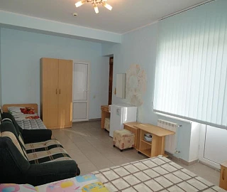 Мебель: диван-кровать, кресло-кровать, тумбочки, журнальный столик, туалетный столик, комод, пуфики, вешалка, зеркало. Удобства: кондиционер, холодильник, телевизор, посуда.