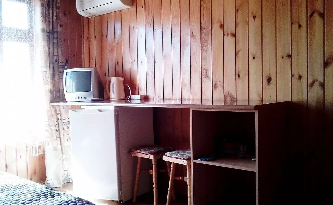 Стандартные номера: ЖК ТВ, сплит-система, холодильник, туалетный столик, прикроватные тумбочки, зеркало, гардеробная, сейф, сан.узел в номере. Возле каждого номера на общем балконе имеются индивидуальные столик и стулья. Горячая и холодная вода постоянно!!!Имеется большая кухня-столовая для самостоятельного приготовления еды, набор посуды и кухонных принадлежностей.