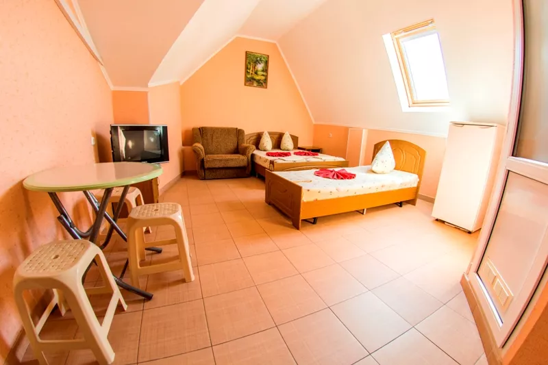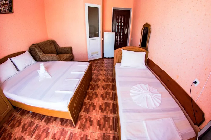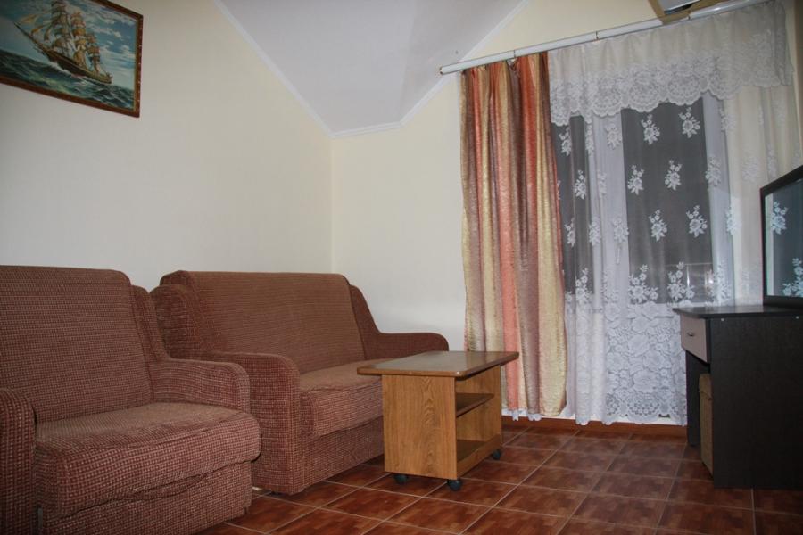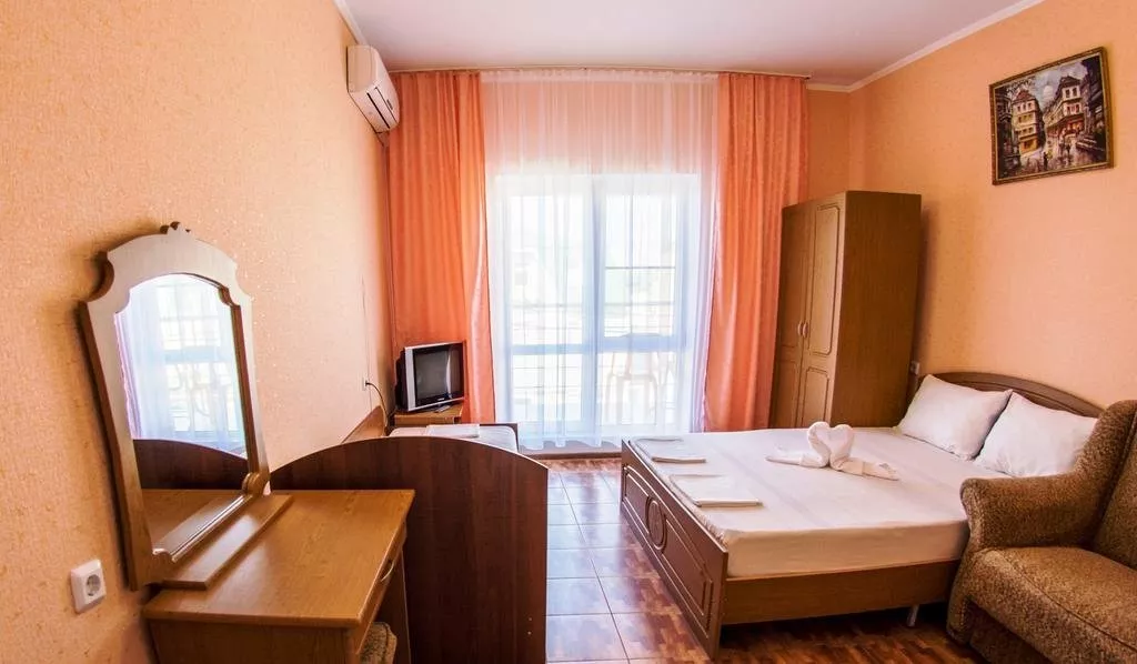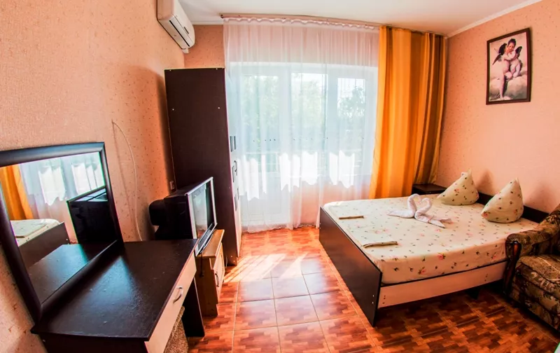Мебель: односпальные или двуспальная кровати, диван-кровать, кресло-кровать, шкаф, прикроватные тумбочки, журнальный столик, туалетный столик, вешалка, зеркало, на балконе набор летней мебели (стол-стулья). Удобства: кондиционер, холодильник, телевизор, балкон.