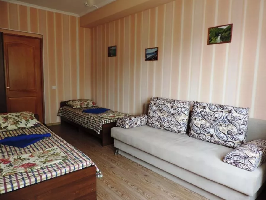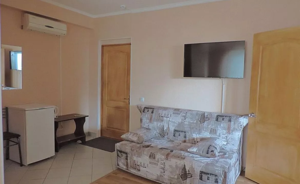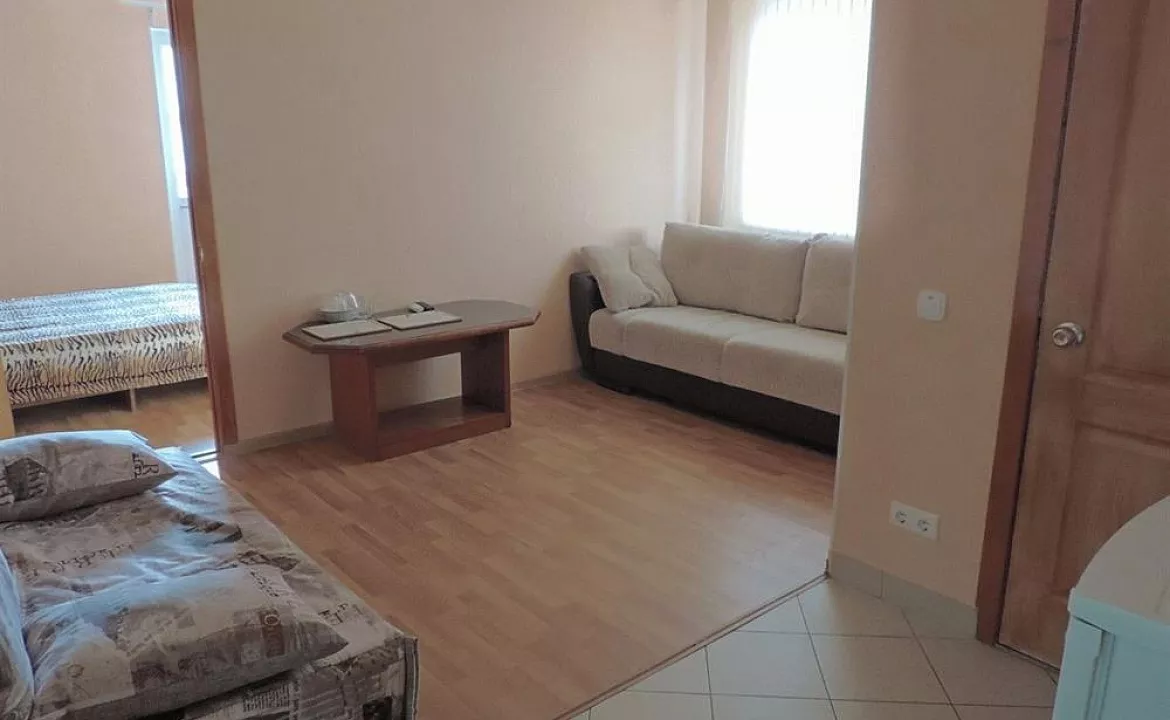Мебель: двуспальная кровать, диван-кровать, кресло-кровать, шкаф, прикроватные тумбочки, журнальный столик, зеркало. Удобства: сплит-система, телевизор, холодильник, эл. чайник, балкон.