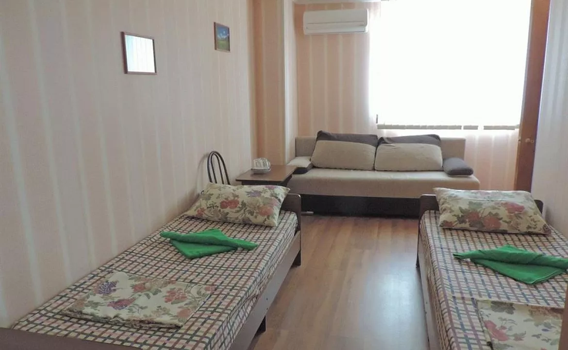 Мебель: односпальные кровати, шкаф, прикроватные тумбочки, журнальный столик, зеркало. Удобства: сплит-система, телевизор, холодильник, эл. чайник, балкон (наличие уточнять).