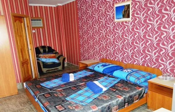 Мебель: двуспальная кровать "King size", 2 односпальные кровати, или двуспальный диван, кресло-кровать, шкаф, туалетный столик, обеденный столик, тумбочки. Удобства: кондиционер (сплит-система), холодильник, телевизор, эл. чайник, интернет.