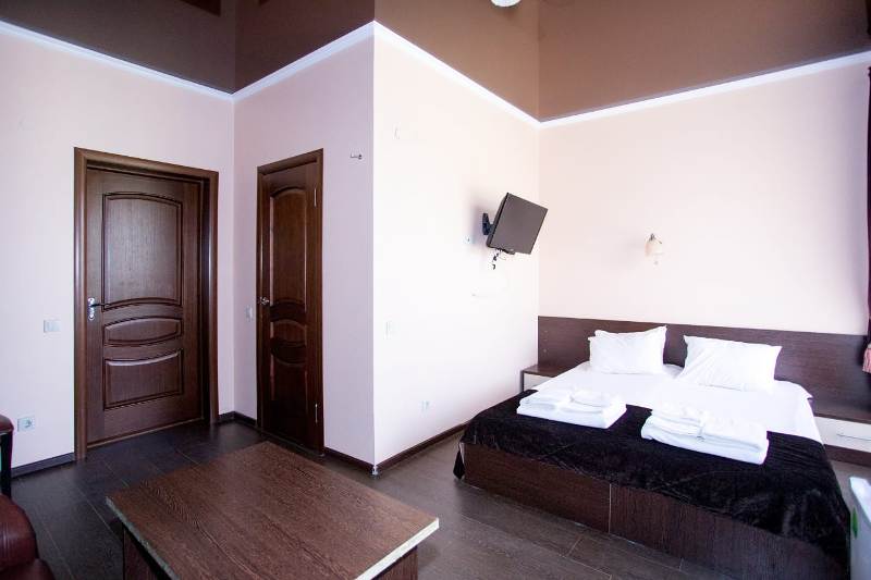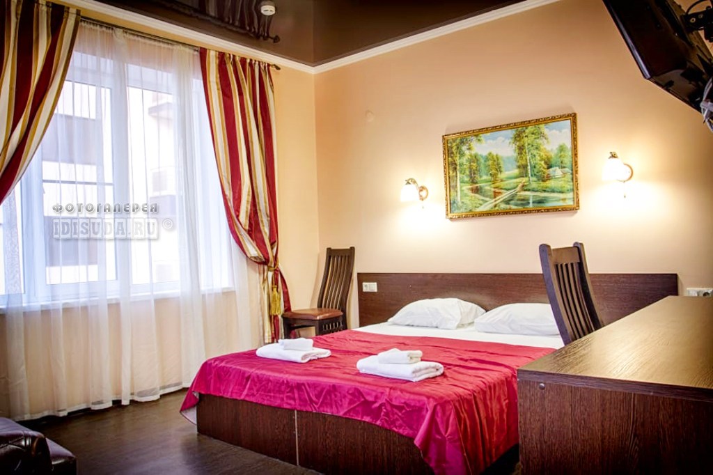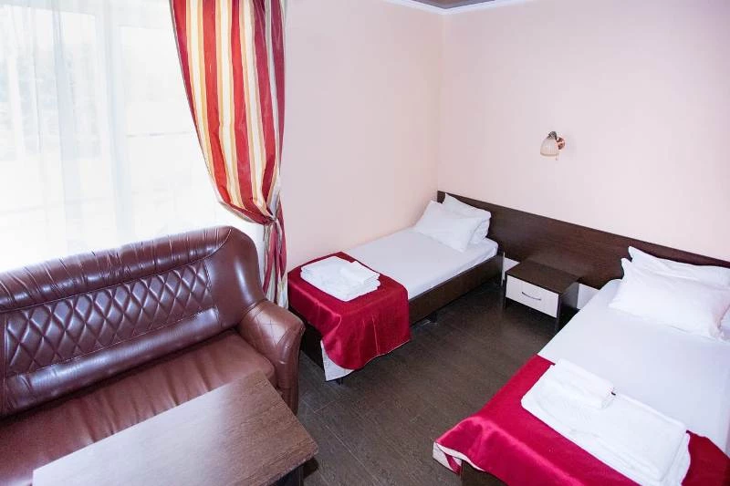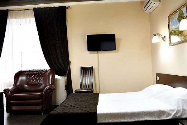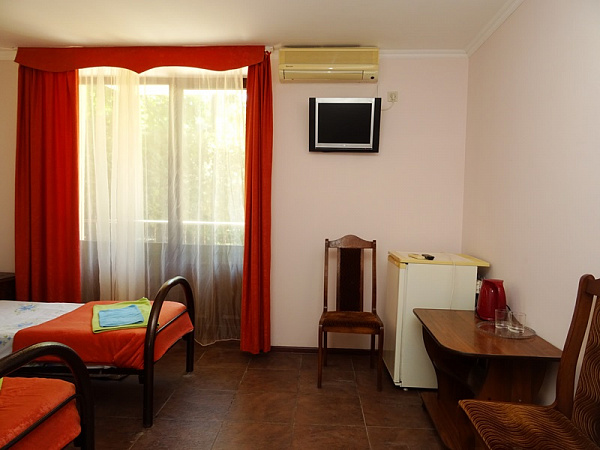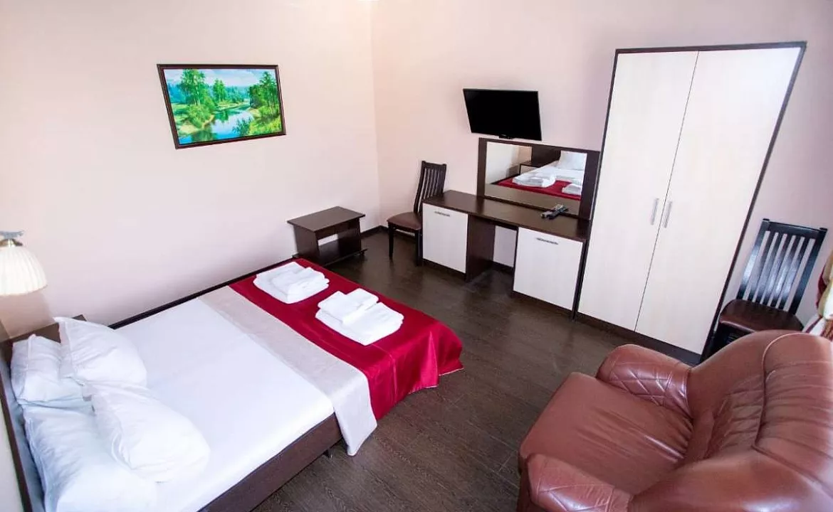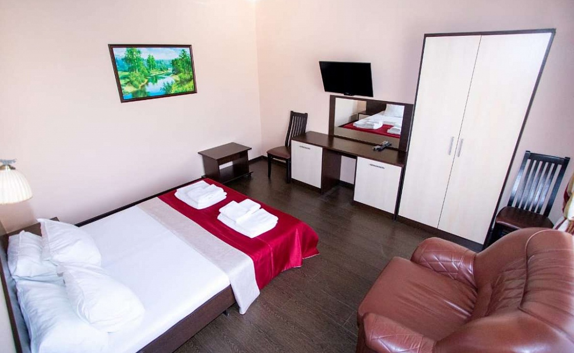 Мебель: односпальные двуспальные кровати, кресло-кровать, шкаф, прикроватные тумбочки, туалетный столик, зеркало. Удобства: сплит-система, холодильник, цифровое ТВ.