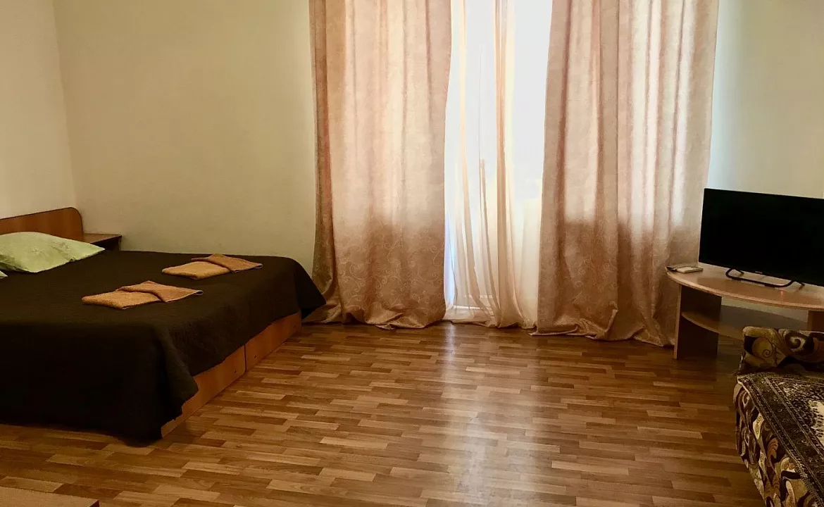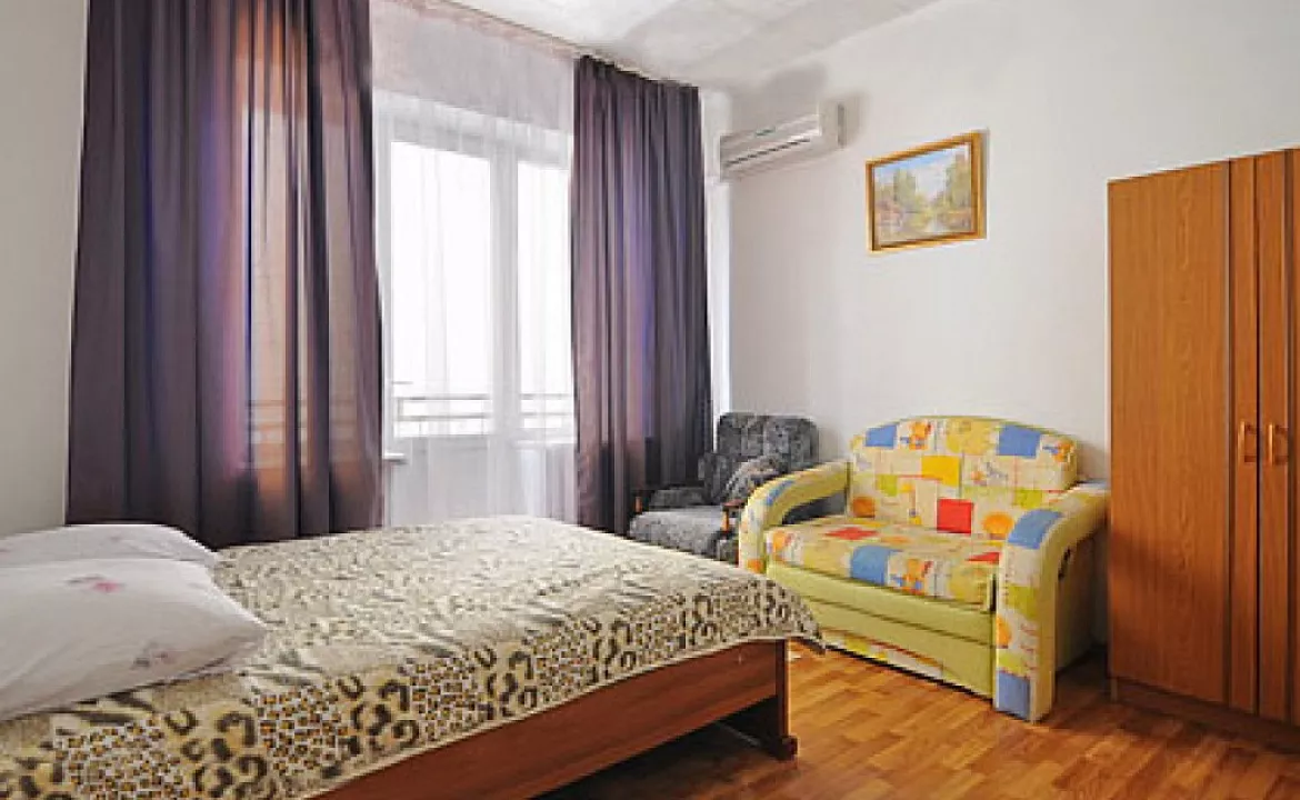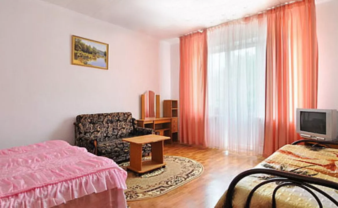Мебель: двуспальные кровати, диван-кровать, кресло-кровать, шкаф, прикроватные тумбочки, журнальный столик, зеркало. Удобства: сплит-система, телевизор, холодильник, эл. чайник, интернет, балкон.