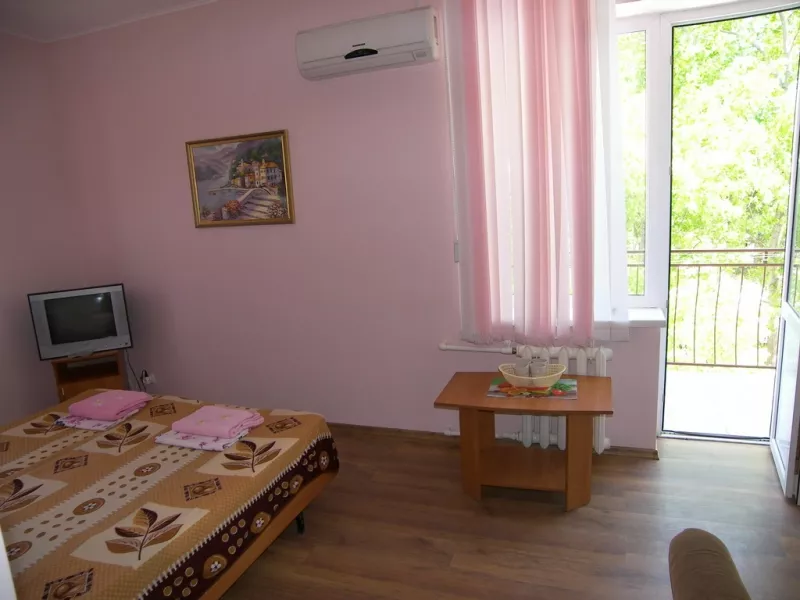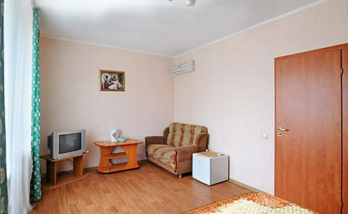 Мебель: односпальные или двуспальная кровати, диван-кровать, стулья, шкаф, стол, прикроватные тумбочки, журнальный столик, туалетный столик, прихожая, зеркало. Удобства: сплит-система, телевизор, холодильник, эл. чайник, интернет, балкон.