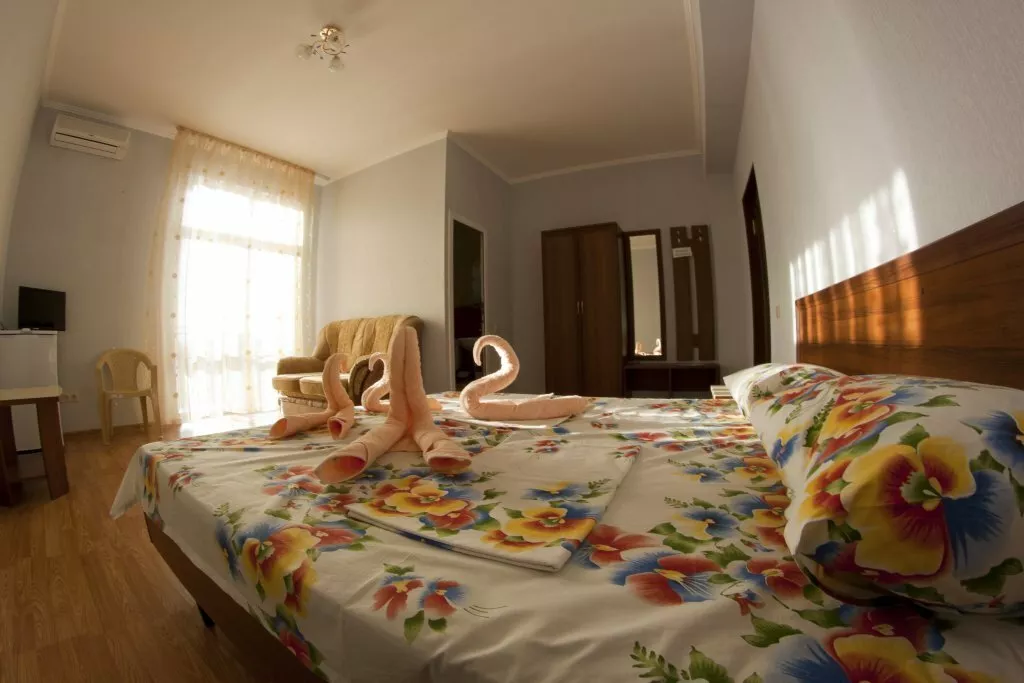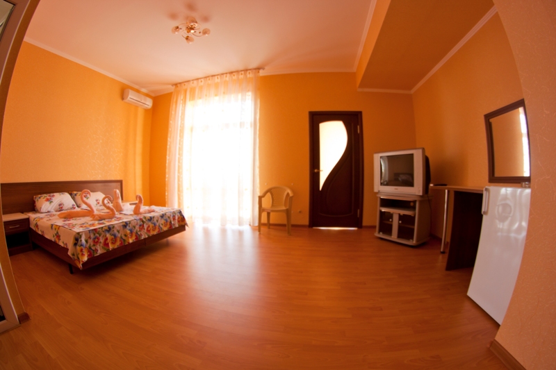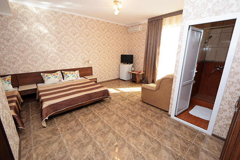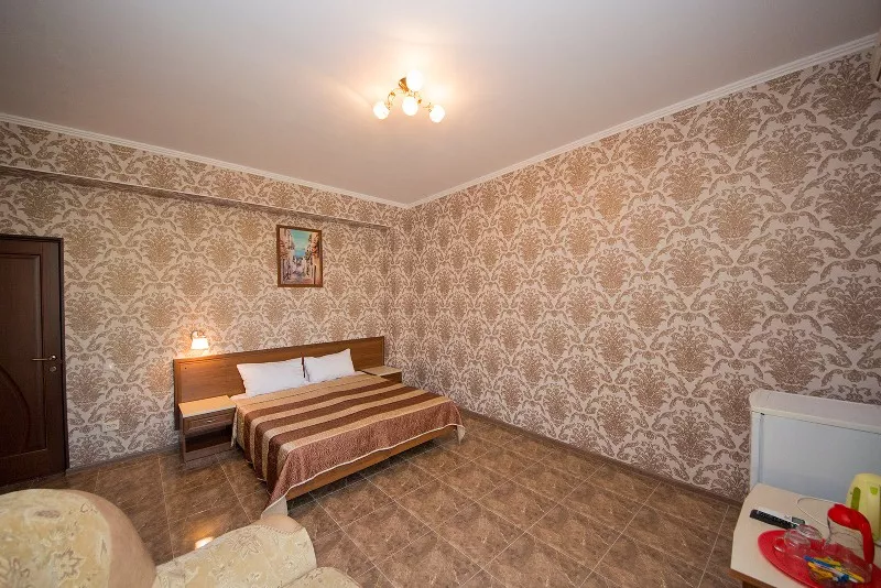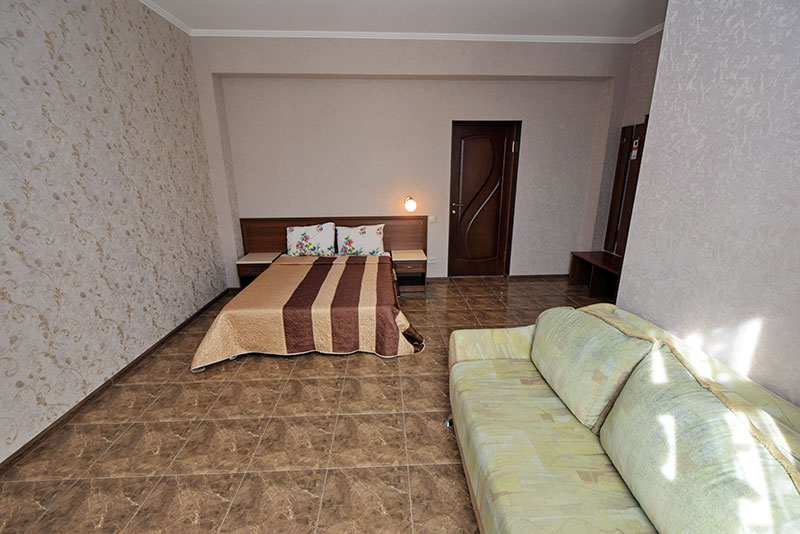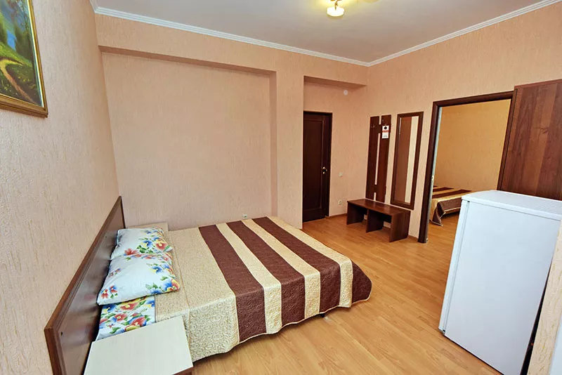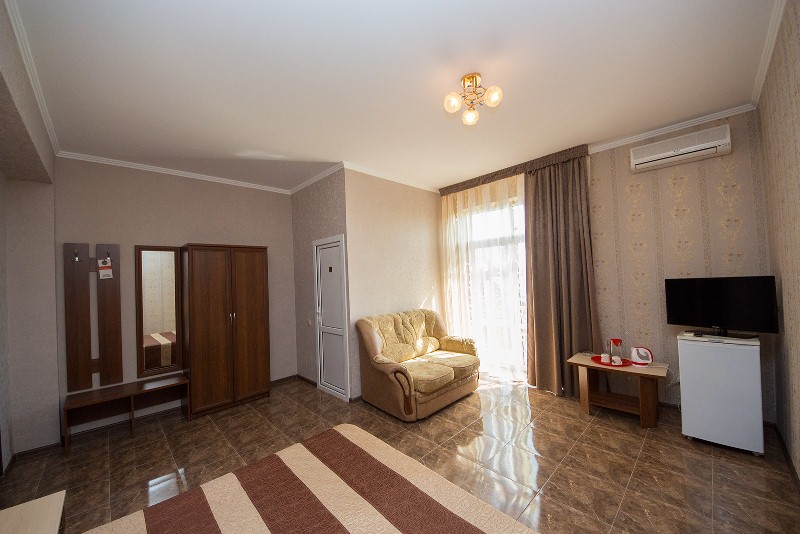 Мебель: односпальные или двуспальная кровати, диван-кровать, кресло-кровать, шкаф, прикроватные тумбочки, журнальный столик, туалетный столик, зеркало. Удобства: сплит-система, телевизор, холодильник, эл. чайник, посуда.