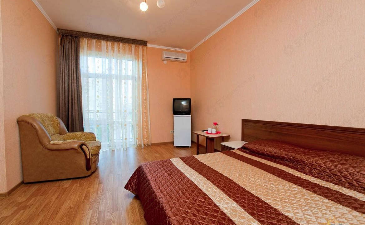 Мебель: односпальные или двуспальная кровати, диван-кровать, кресло-кровать, шкаф, прикроватные тумбочки, журнальный столик, туалетный столик, зеркало. Удобства: сплит-система, телевизор, холодильник, эл. чайник, посуда, балкон.