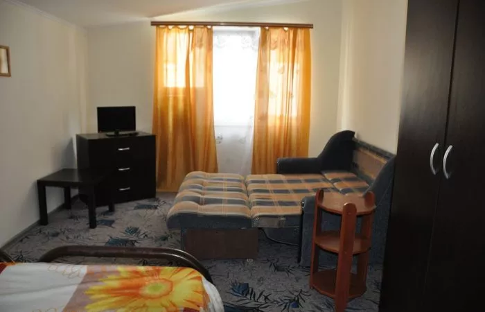Мебель: односпальные или двуспальная кровати, шкаф, журнальный столик, комод. Удобства: кондиционер, телевизор.