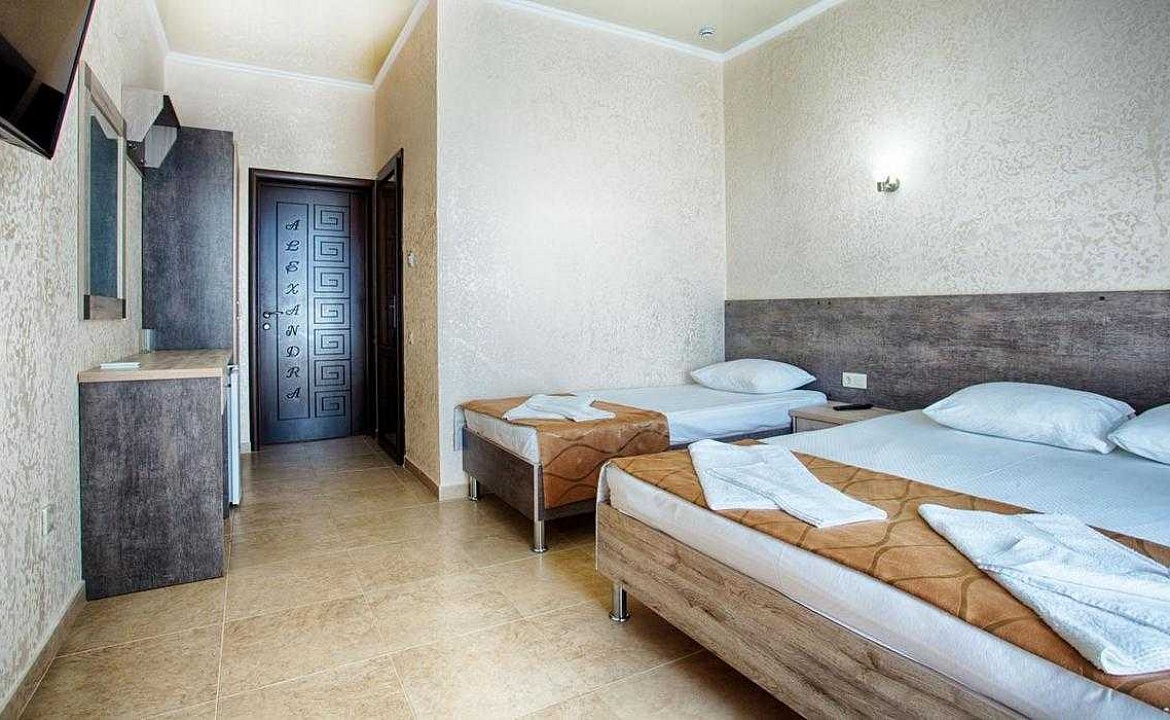 Мебель: двуспальная и односпальная кровати, прикроватные тумбочки, стол, стулья, платяной шкаф, журнальный столик, зеркало, прихожая, вешалки, уличная мебель. Удобства: сплит-система, мини-холодильник, телевизор, спутниковое/цифровое ТВ, интернет, эл. чайник (по требованию), фен (по требованию), балкон (на 2 и 3 этажах).