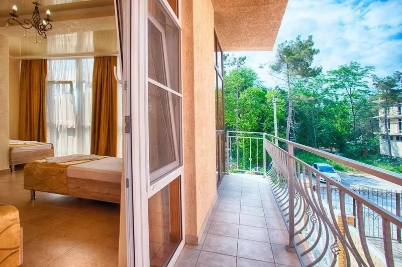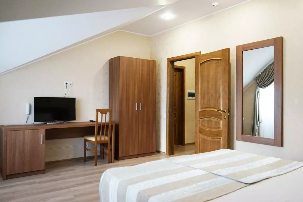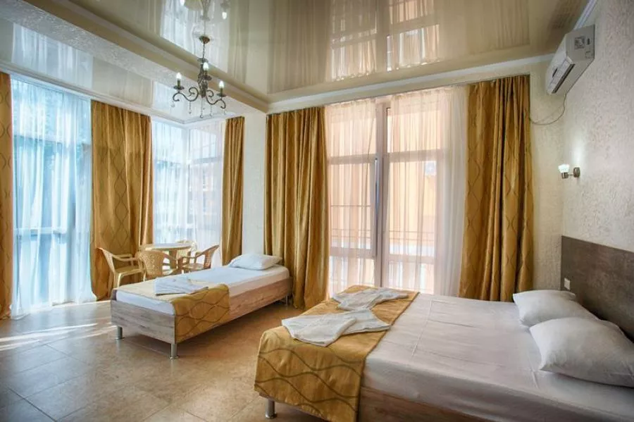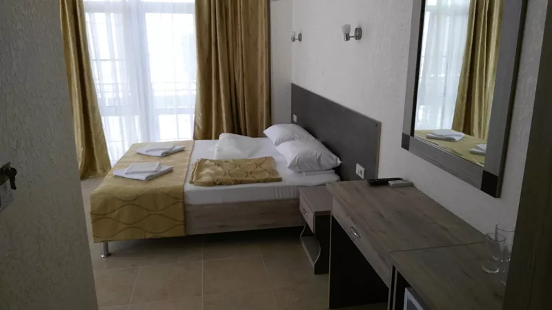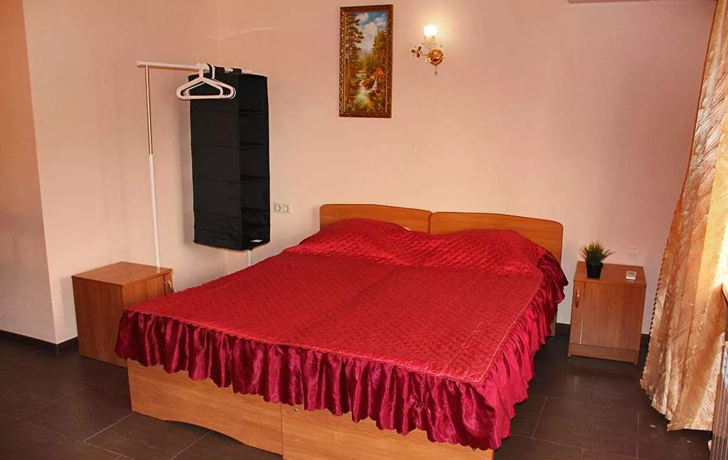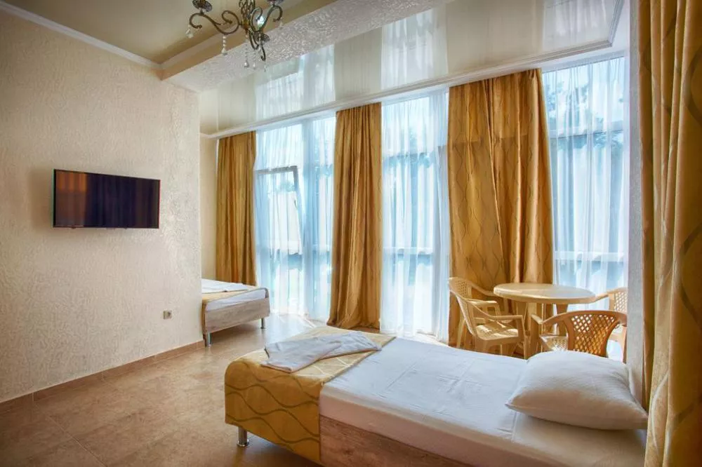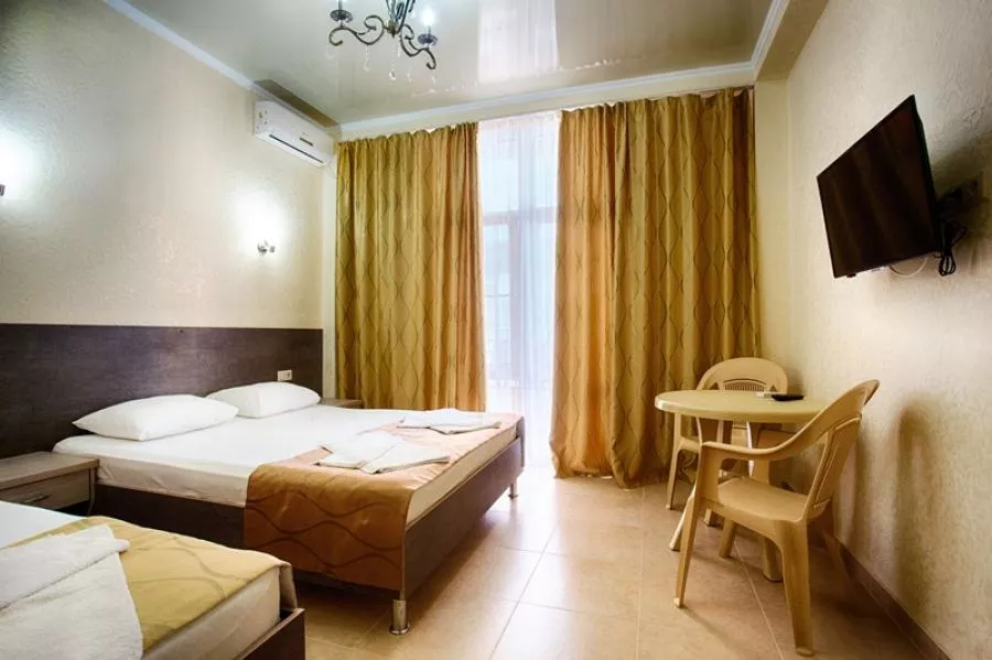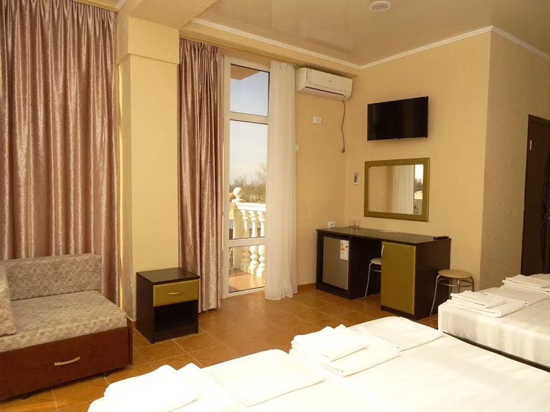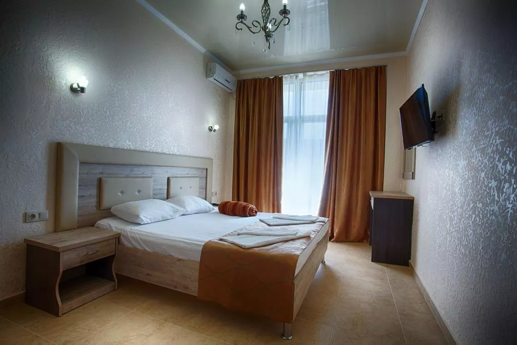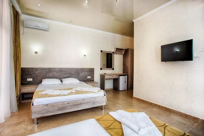 Мебель: двуспальная и односпальная кровати, прикроватные тумбочки, стол, стулья, платяной шкаф, журнальный столик, зеркало, прихожая, вешалки, уличная мебель. Удобства: сплит-система, мини-холодильник, телевизор, спутниковое/цифровое ТВ, интернет, эл. чайник (по требованию), фен (по требованию), балкон (на 2 и 3 этажах).