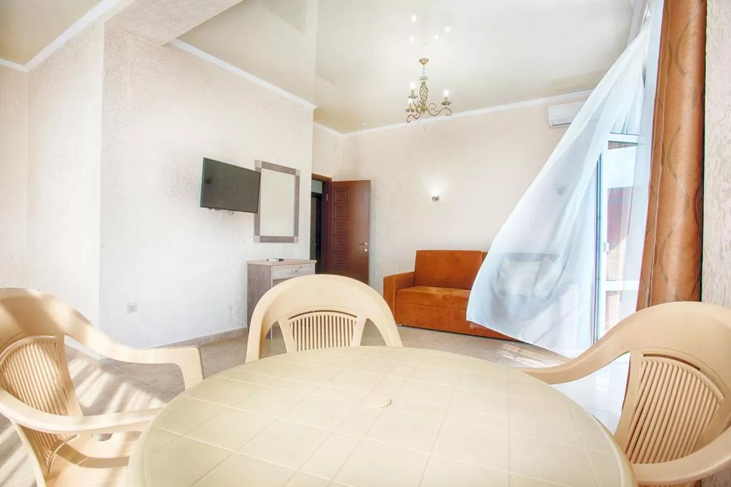 Мебель: 3 односпальные и двуспальная кровати, прикроватные тумбочки, стол, стулья, платяной шкаф, журнальный столик, зеркало, прихожая, вешалка, уличная мебель. Удобства: сплит-система, мини-холодильник, телевизор, спутниковое/цифровое ТВ, интернет, эл. чайник (по требованию), фен (по требованию), балкон.