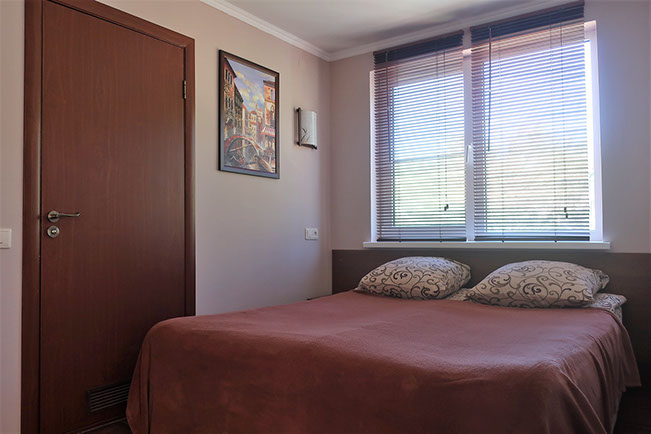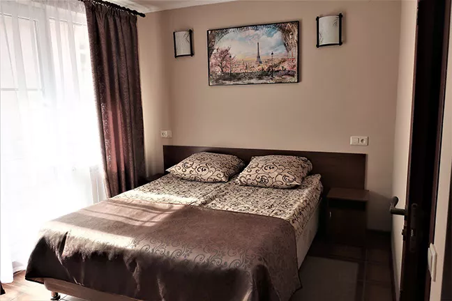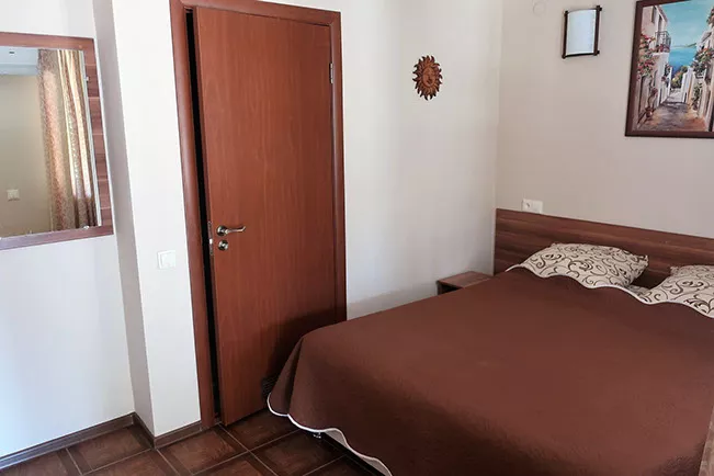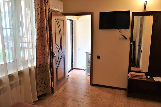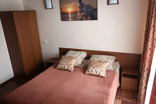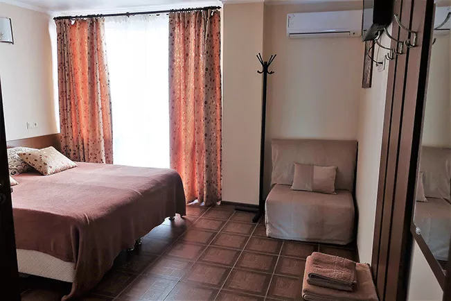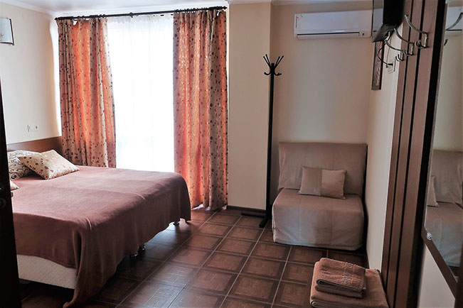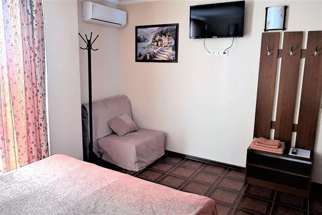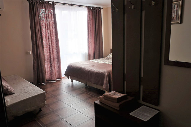 Если вы остановитесь в гостевом доме «Шоколад», вам не нужно будет искать место для завтраков, обедов и ужинов. Их вы сможете приготовить самостоятельно. К услугам гостей нашего мини-отеля – кухни, оборудованные всем необходимым для приготовления пищи, открытый бассейн с подогревом воды и самое главное – просторные террасы с видом на горное ущелье, где так приятно выпить утренний кофе и полюбоваться вечерним закатом. В шаговой доступности от «Шоколада» — супермаркет, аптека, СПА-комплекс отеля «Гамма», множество магазинов, аквапарк. Кроме того поселок Ольгинка предлагает своим гостям множество экскурсий и развлечений, в числе которых джиппинг, дайвинг, конные и пешие прогулки по живописнейшим уголкам прибрежной зоны. Если вам и этого мало, в 300 метрах от гостевого дома — остановка общественного транспорта, откуда Вы легко доберетесь в любую точку черноморского побережья. Гарантируем, что в любую погоду Вам не придется скучать! Приятный бонус всем гостям «Шоколада»: бесплатный Wi-Fi, телевидение, автостоянка. Другие номера: 2-местный (1 этаж), 2,3,4-местный.