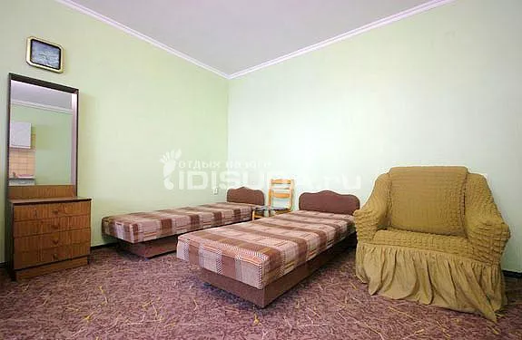 Спальных мест: 2. Площадь номера: 12 кв.м. Комнат в номере: 1 Этаж: 2. Санузел+Душ: на этаже (на 2 номера). Мебель: односпальные и двуспальная кровати, кресло-кровать, шкаф, стулья, прикроватные тумбочки, журнальный столик, вешалка, зеркало. Удобства: кондиционер, телевизор, цифровое ТВ, интернет. А так же есть номера:"Эконом" 3х-местный, "Номер-студия" 2х-местный, "Стандарт" 3х-местный, "Стандарт" 4х-местный, "Полулюкс" 3х-местный, "Коттедж" 2х-комнатный, "2х-комнатный номер для компании" с балконом.